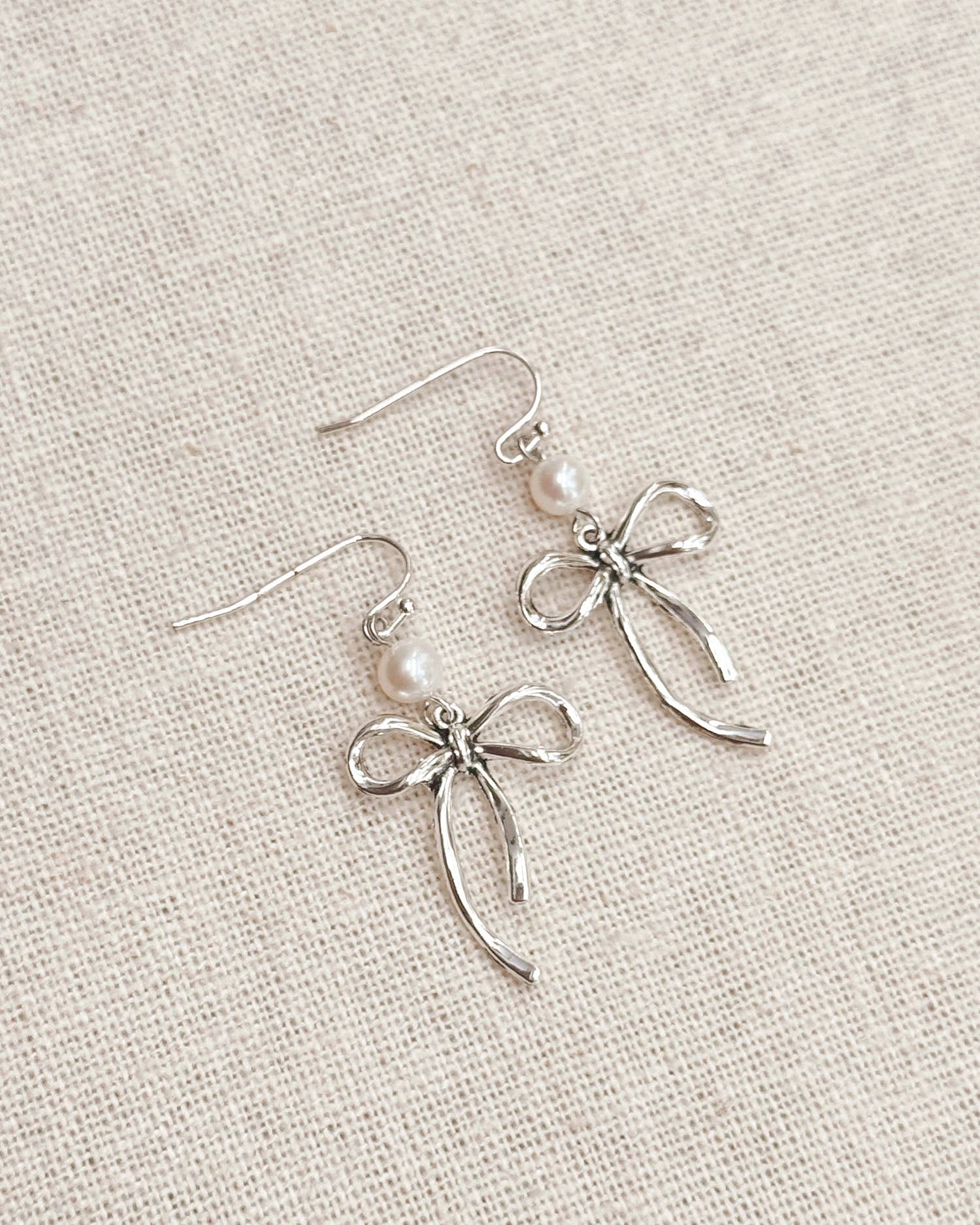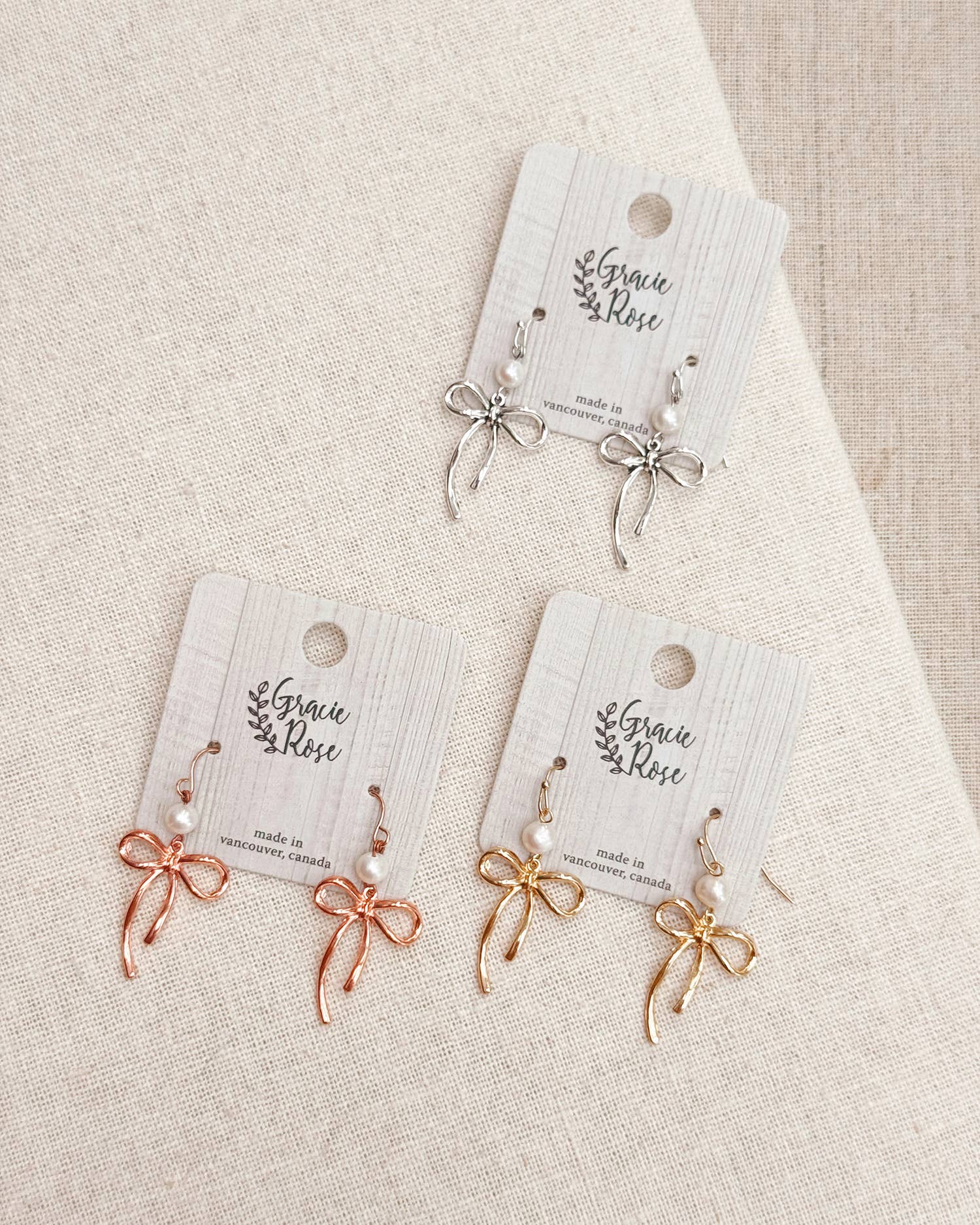 Bow pearl earrings in gold, and silver finishes. Feminine drop style with freshwater pearl accents, perfect for everyday or bridal. These bow pearl earrings come in gold, rose gold, and silver finishes, each accented with a luminous freshwater pearl. Their feminine design balances playful charm with timeless elegance, making them versatile for bridal styling, gifting, or daily wear. Lightweight and easy to style, these earrings are a boutique favourite that work across occasions and seasons. - Gold plated / Silver plated finishes - Length: 1.75" - Freshwater pearls - Matching necklaces available in shop - Made in Vancouver, Canada