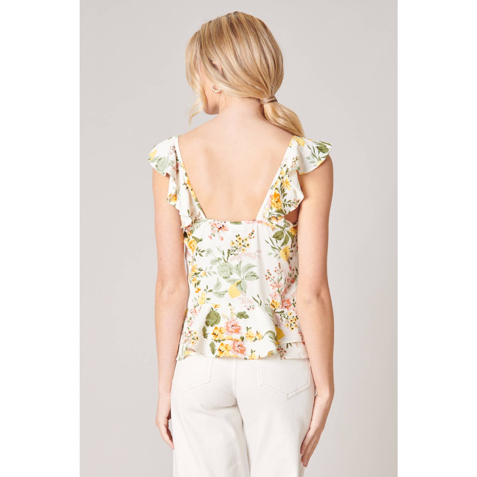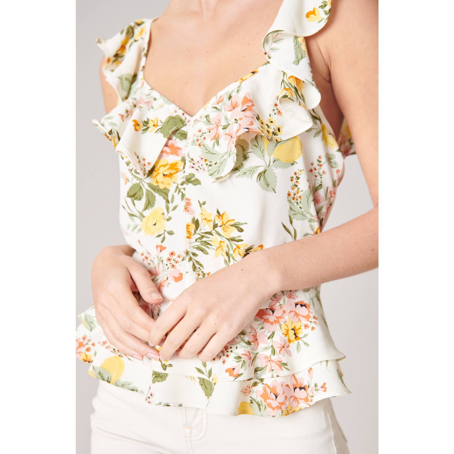 Soft pastel floral clusters are featured on the Ruffle Top.