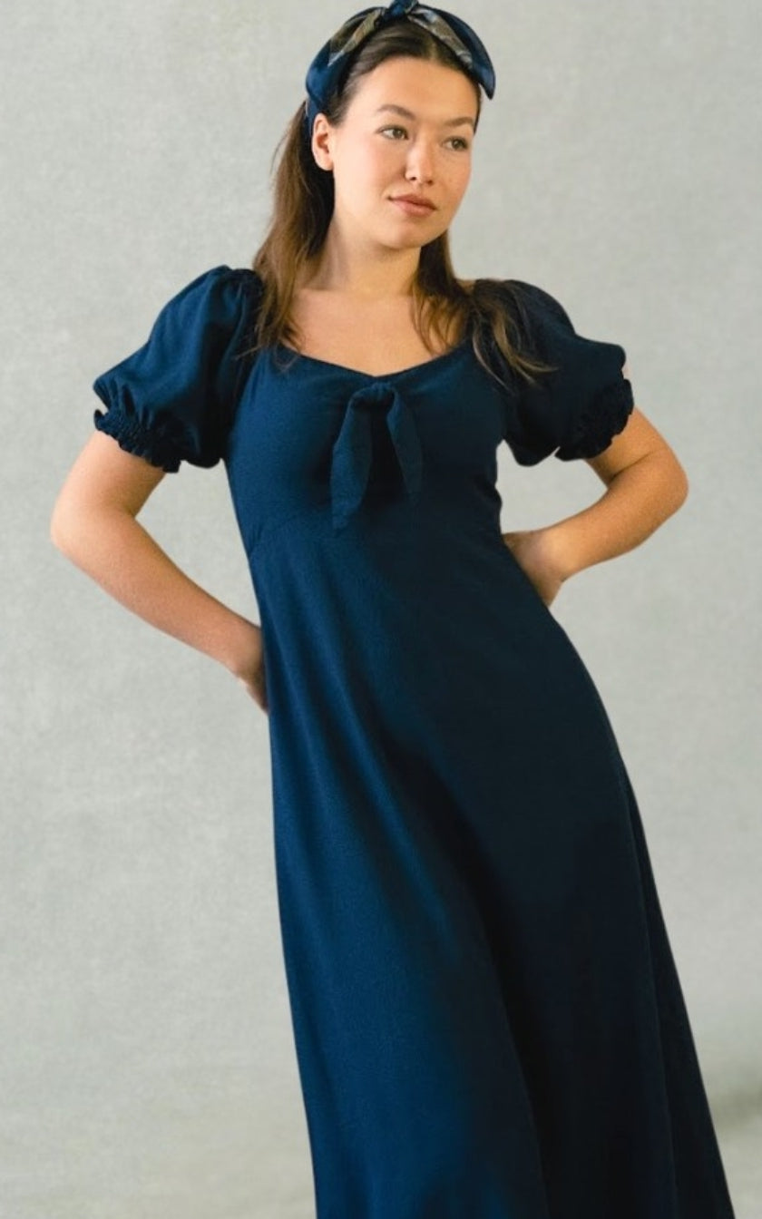 The short puff sleeves add a playful touch, while the A-line silhouette flows gracefully for a flattering fit.