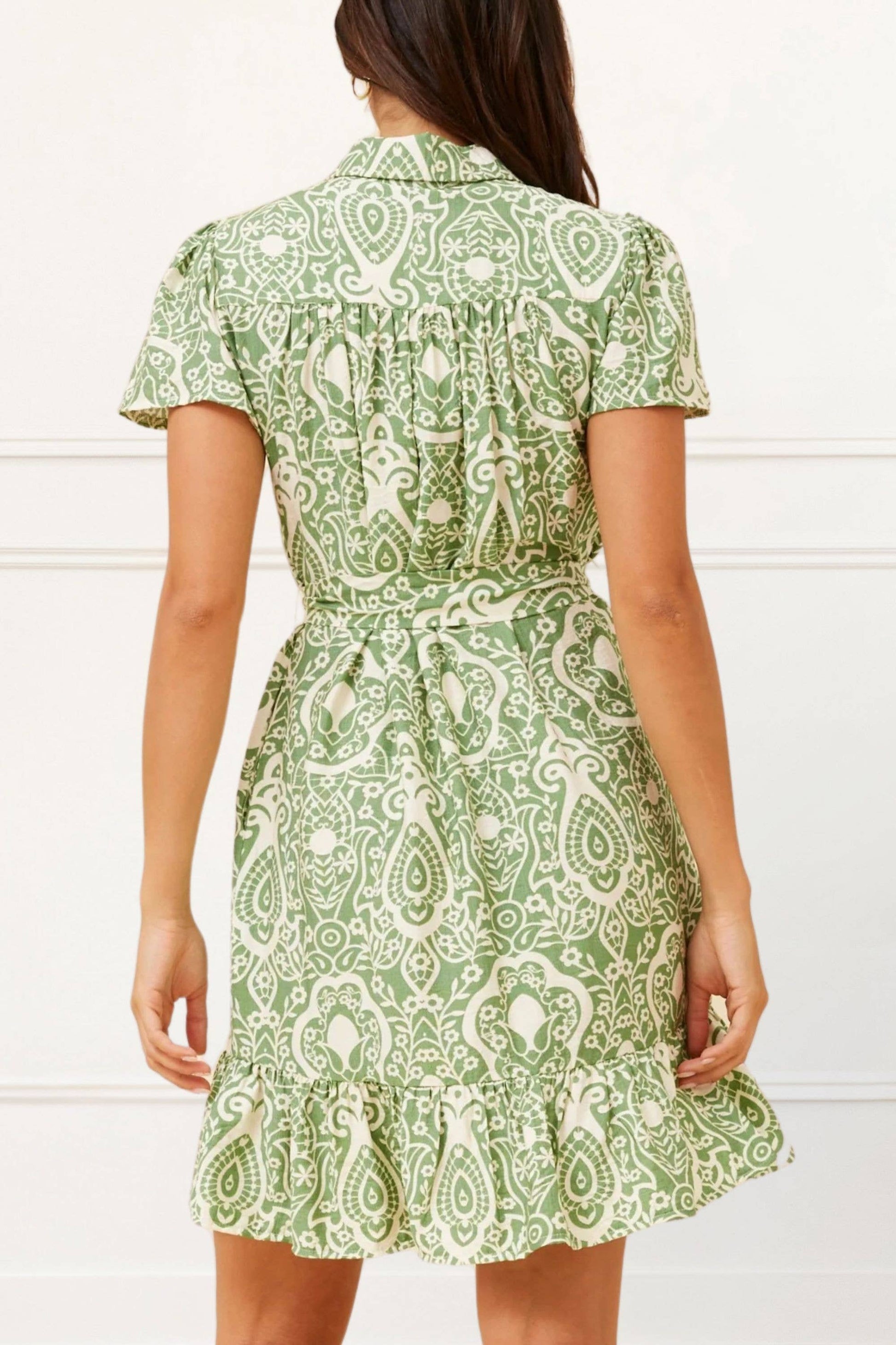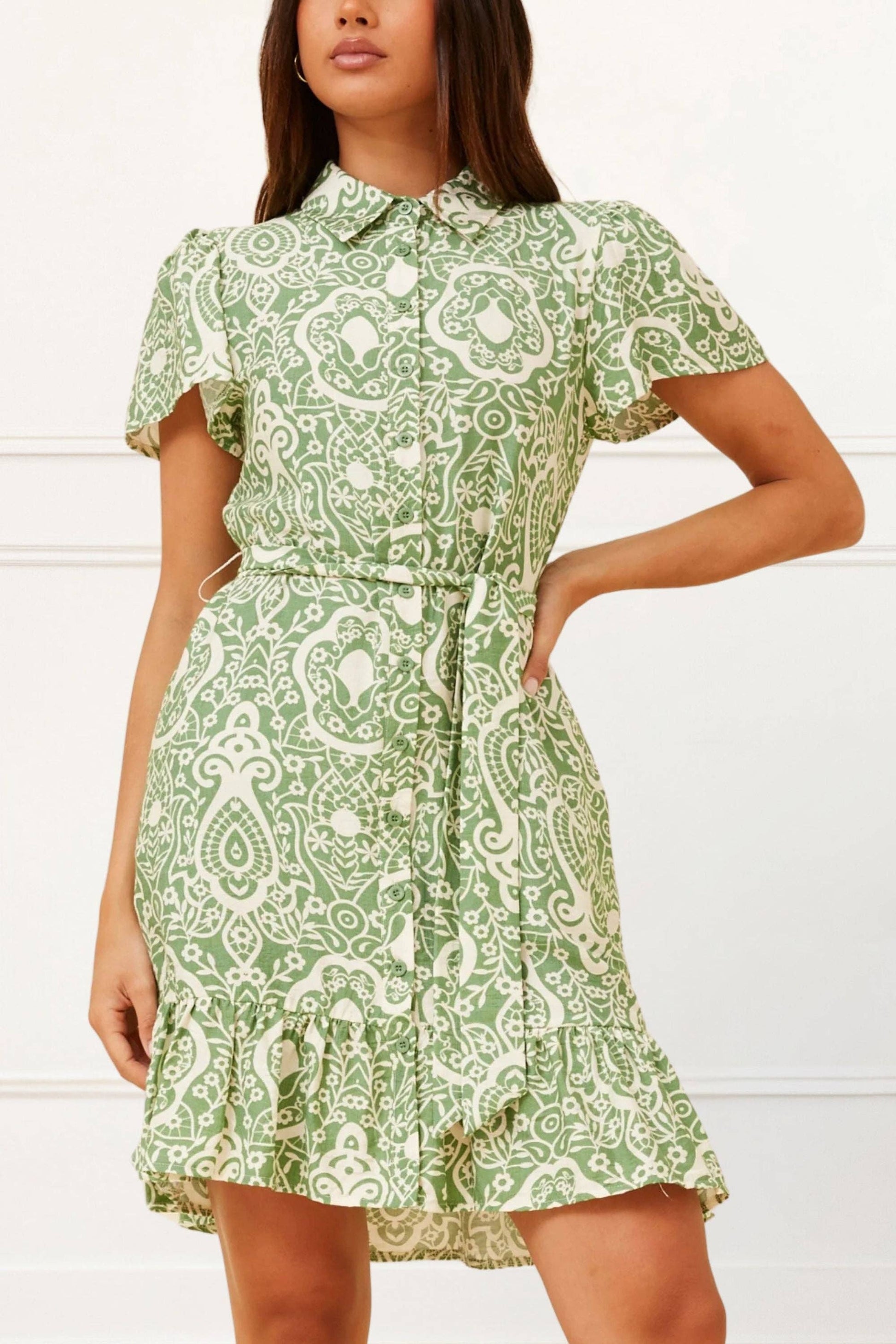 The Jade Shirt Dress in green is a stylish and relaxed piece with a boho print that channels carefree, earthy vibes. Made from a comfortable soft, breathable fabric, it feels perfect for warm days.
