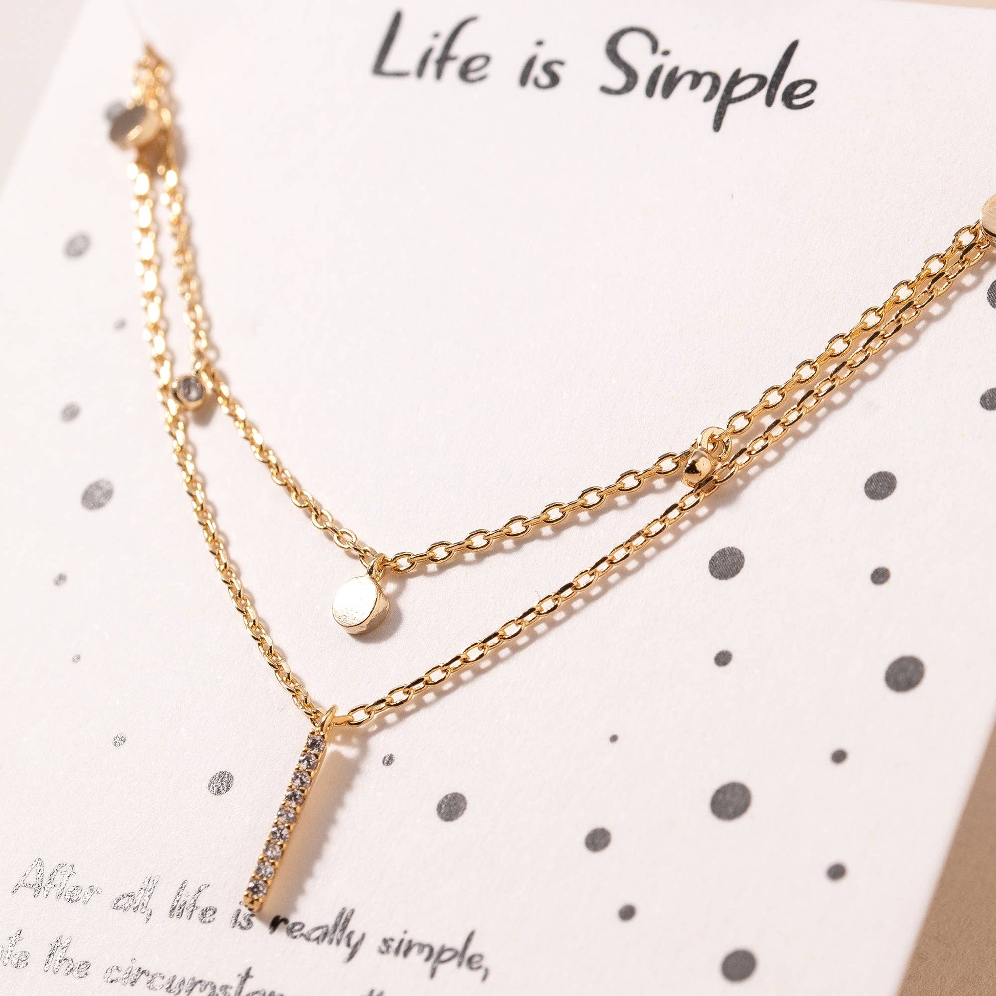 Layered charms necklace with bar charm and cubic zirconia detail.
