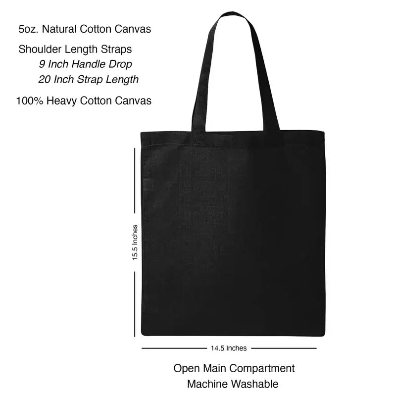 Black cotton canvas tote bag, white ink, screen print, heat set