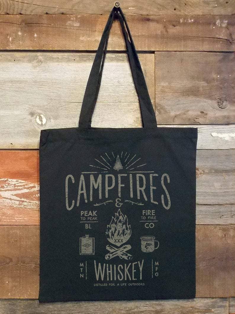This hand printed tote bag features an original illustration showcasing the words Campfires & Whiskey blended perfectly with some rough and rugged graphics of a campfire, flask and retro camper mug!