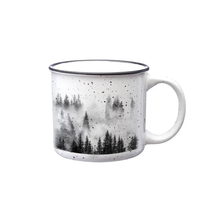 This nature themed mug showcasing a wrapping print of a forest that is mixed in with some clouds passing through it during a storm! The image is bumped up in contrast to really pop the trees and it creates and eye catching pattern of trees and mist! This mug is a great mug for anyone who enjoys the outdoors and is the perfect gift to bring in some nature to any tabletop! Use our mugs in your RV, for your next camping trip or use at home as a souvenir of your last trip or mountain vacation get away.