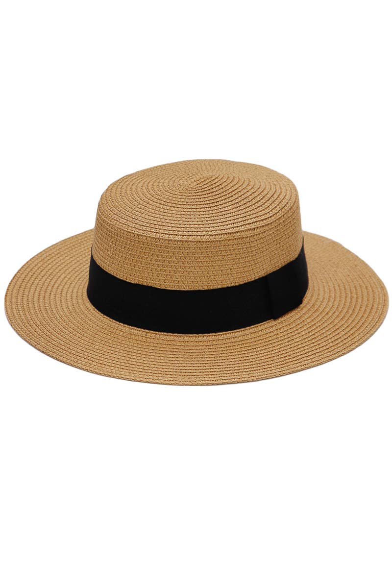 Thick Grosgrain Black Band Decor Paper Straw Floppy Brim Flat Top Boater Beach Hat