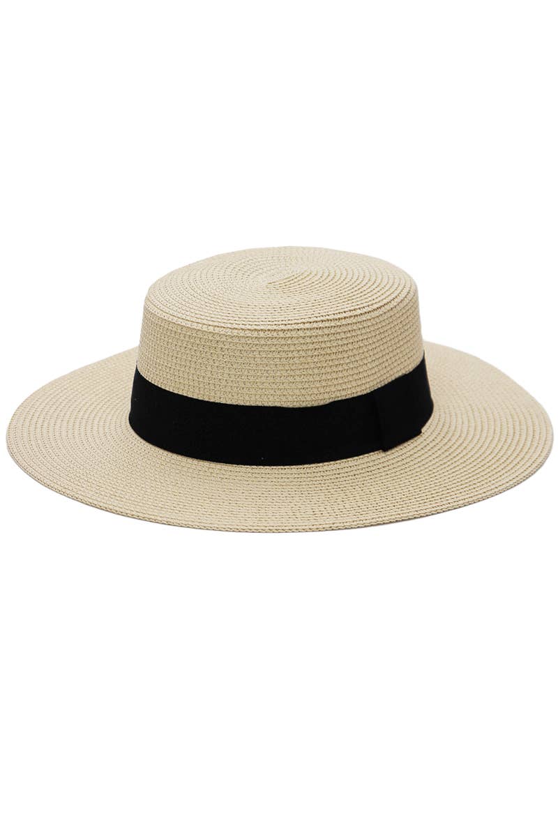 Thick Grosgrain Black Band Decor Paper Straw Floppy Brim Flat Top Boater Beach Hat