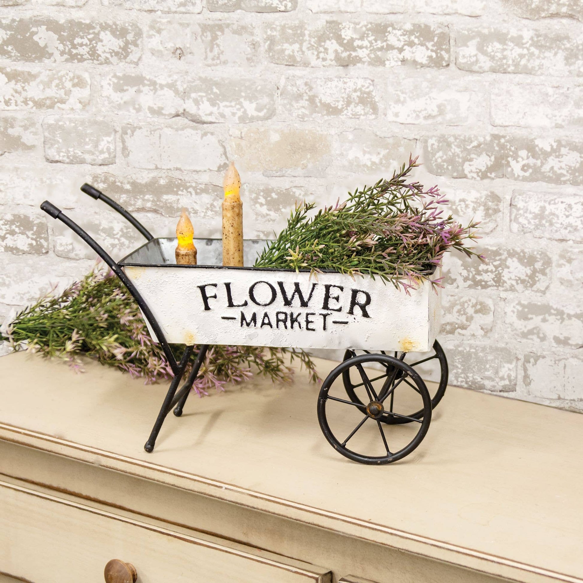 Vintage Flower Market Cart is a galvanized metal tabletop accent with weathered white paint and distressed detailing. It has embossed lettering that reads, “Flower Market,” and can be used to display florals and ornaments. Measures 10" high by 15" wide by 6" deep.