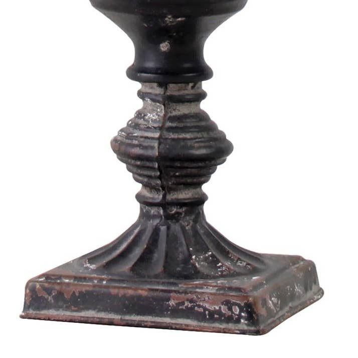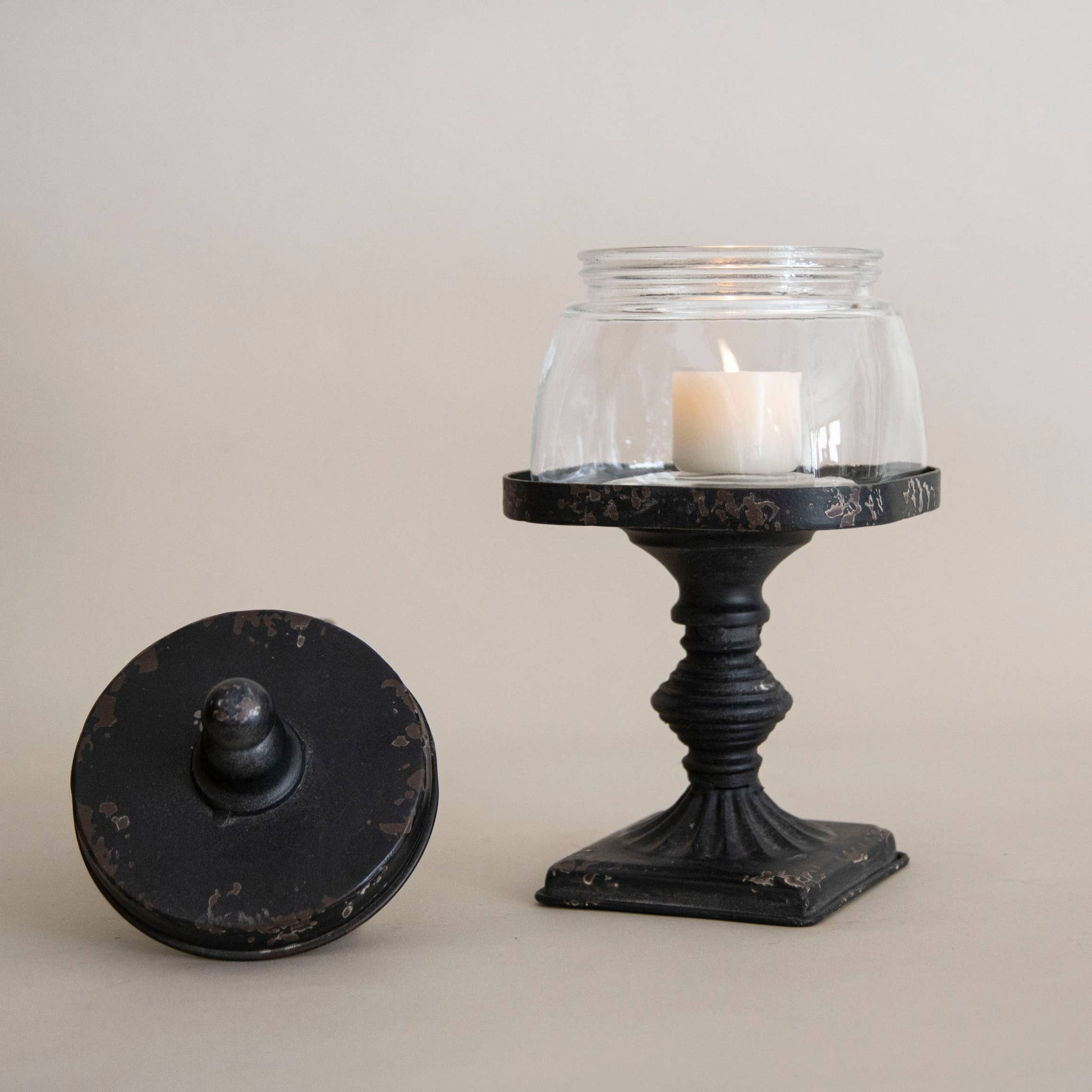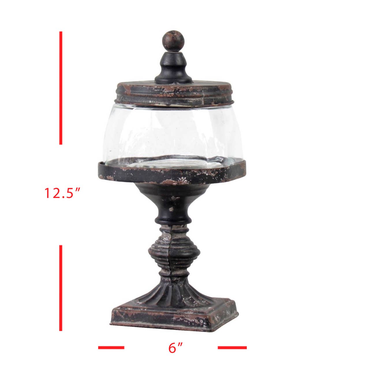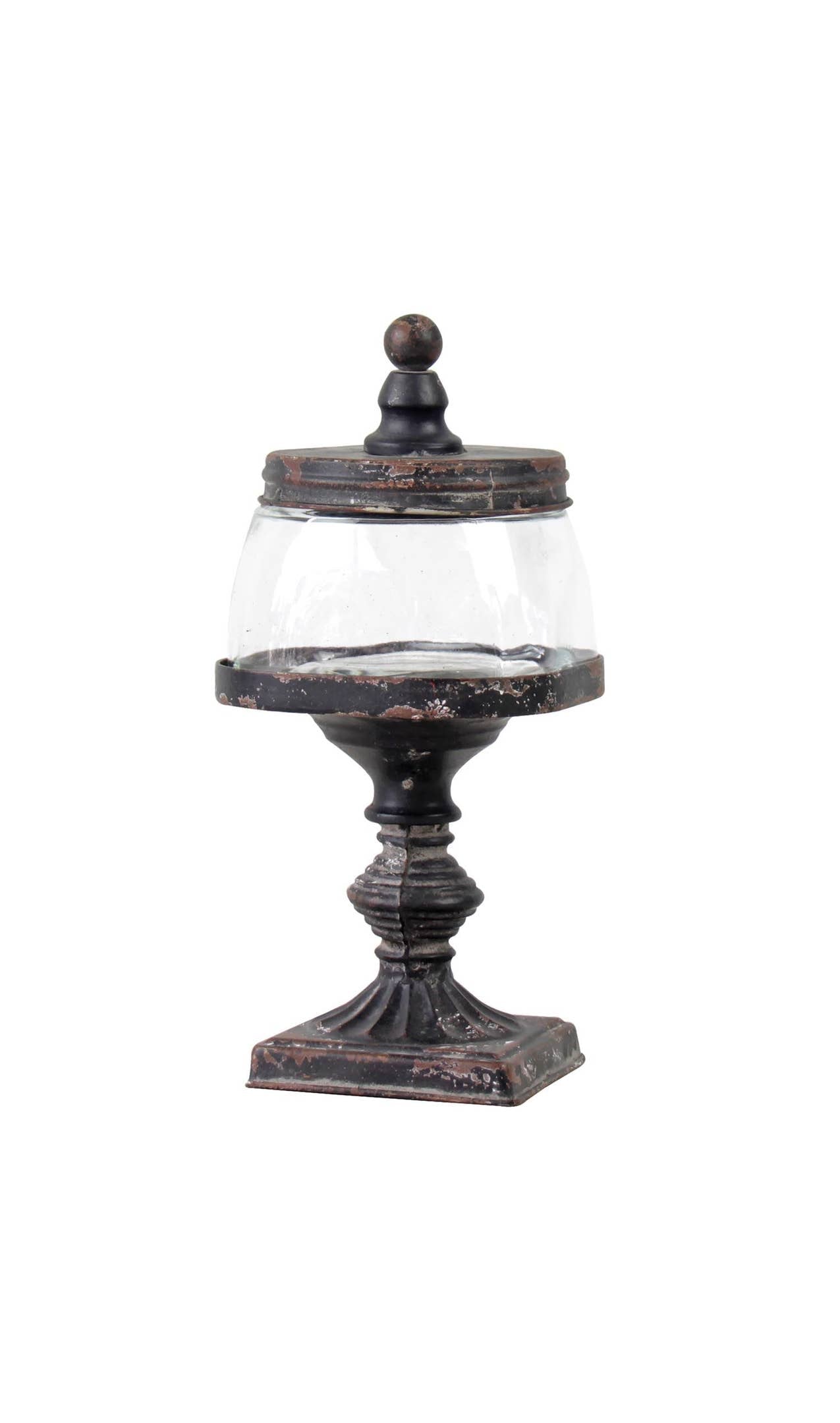 The dark antiqued metal encases a glass jar topped with a charming finial.