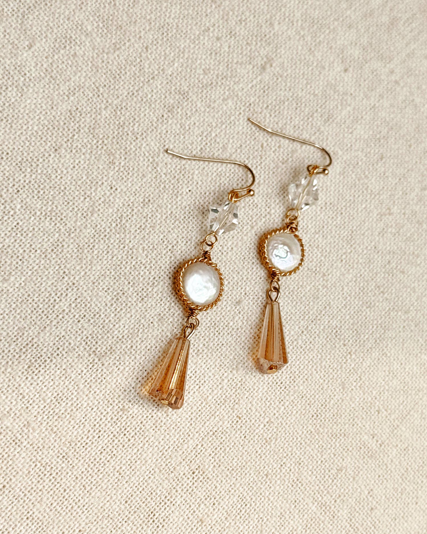 Handmade earrings featuring framed freshwater pearls and crystal tassels bring playful elegance to any look. Lightweight and full of movement.