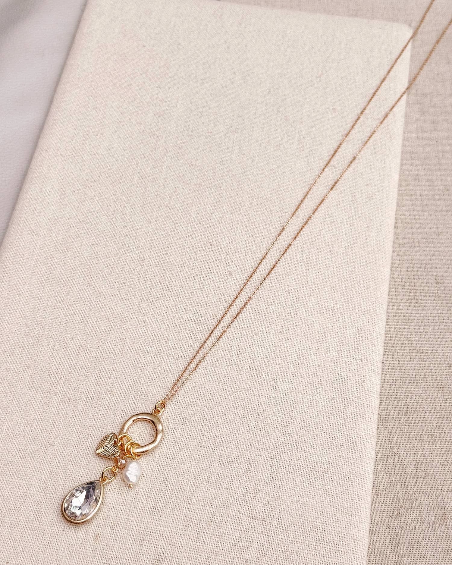 Golden tones, a radiant heart charm, and delicate angel wings create a necklace that celebrates love and light. Accented with a freshwater pearl and a sparkling rhinestone for subtle luminosity. A heartfelt keepsake and everyday favorite.
