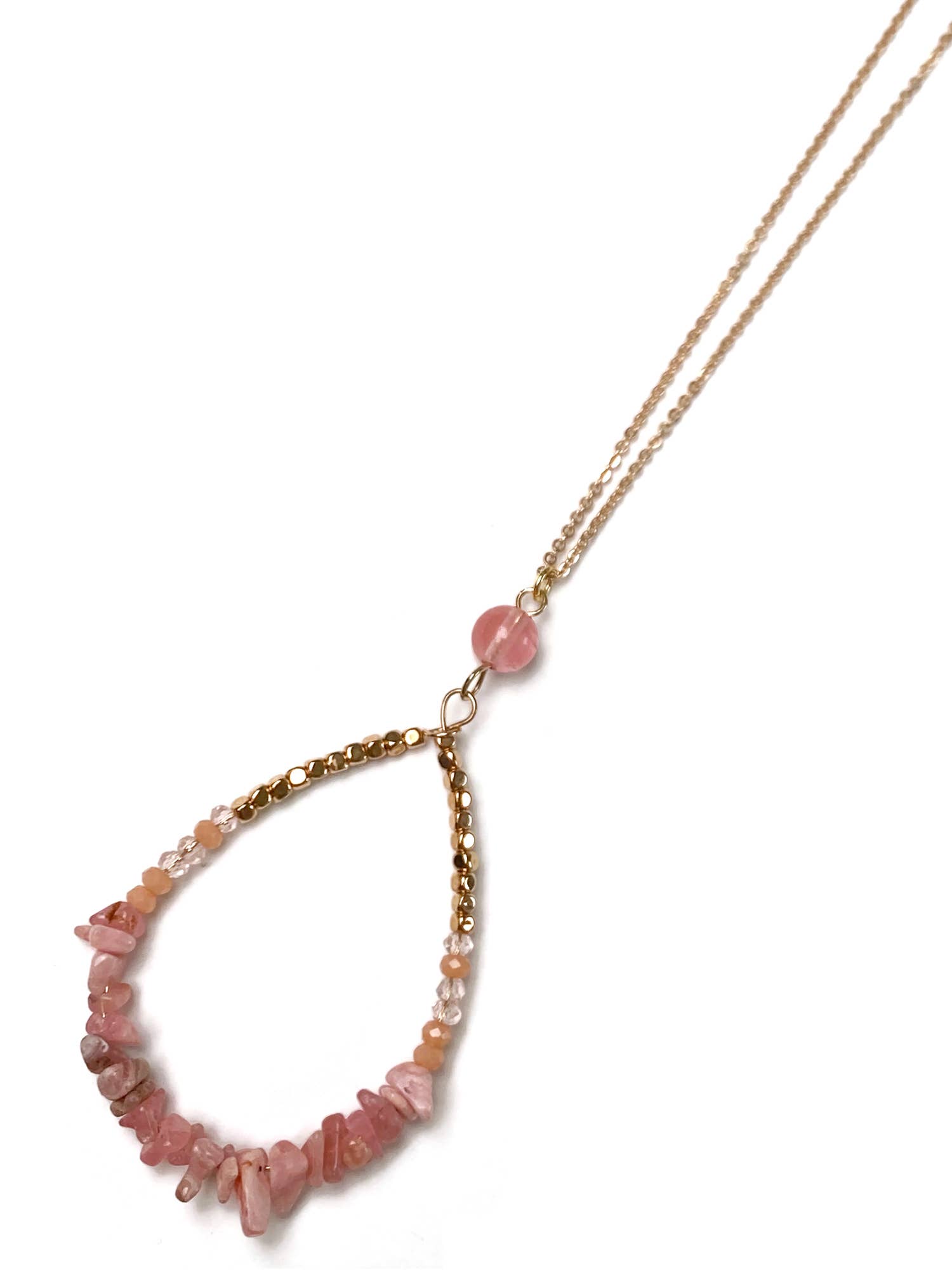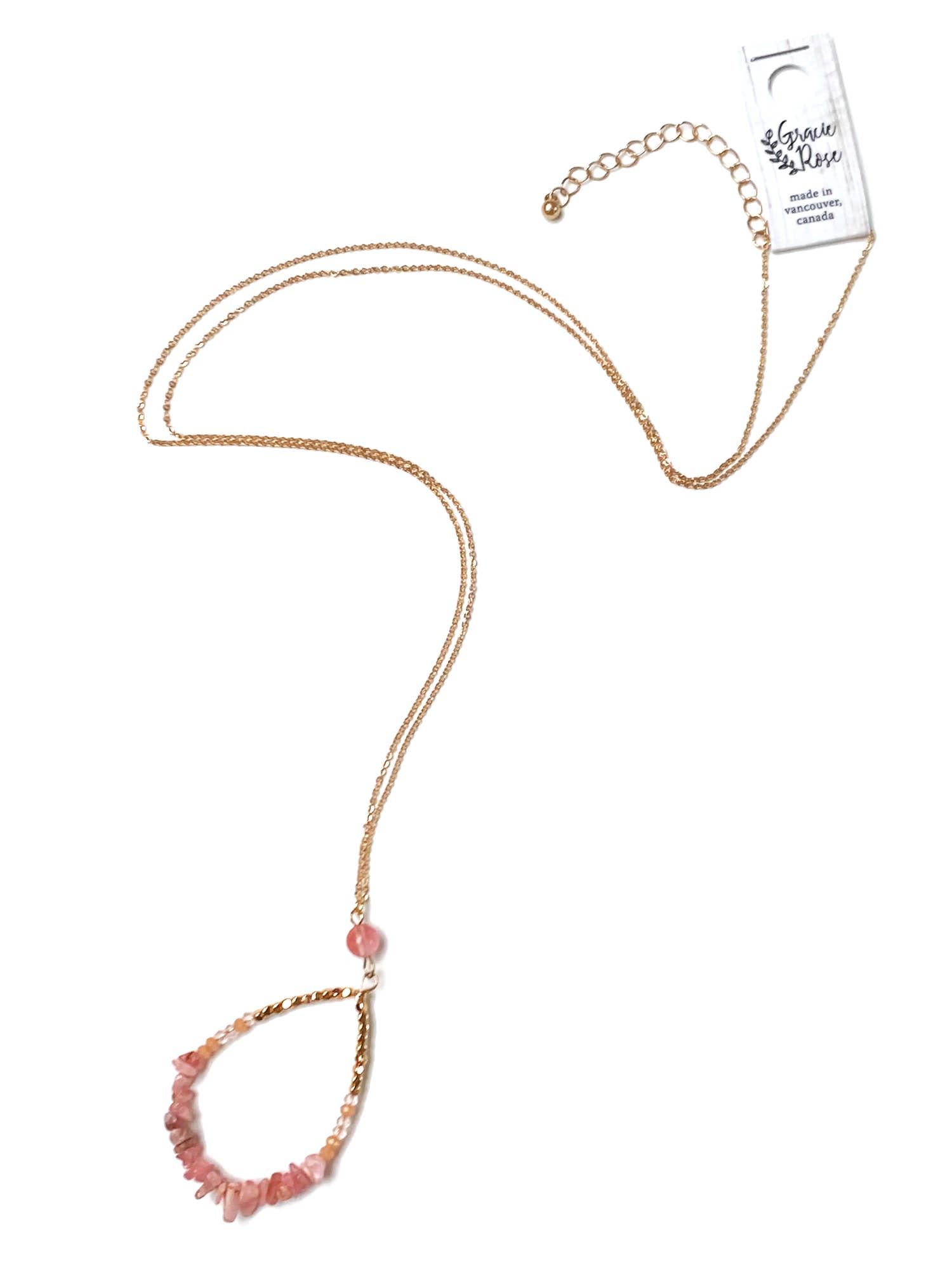 Gracie Rose Designs - Gold Semi-Precious Chip Beaded Teardrop Pendant Necklace: Strawberry Quartz