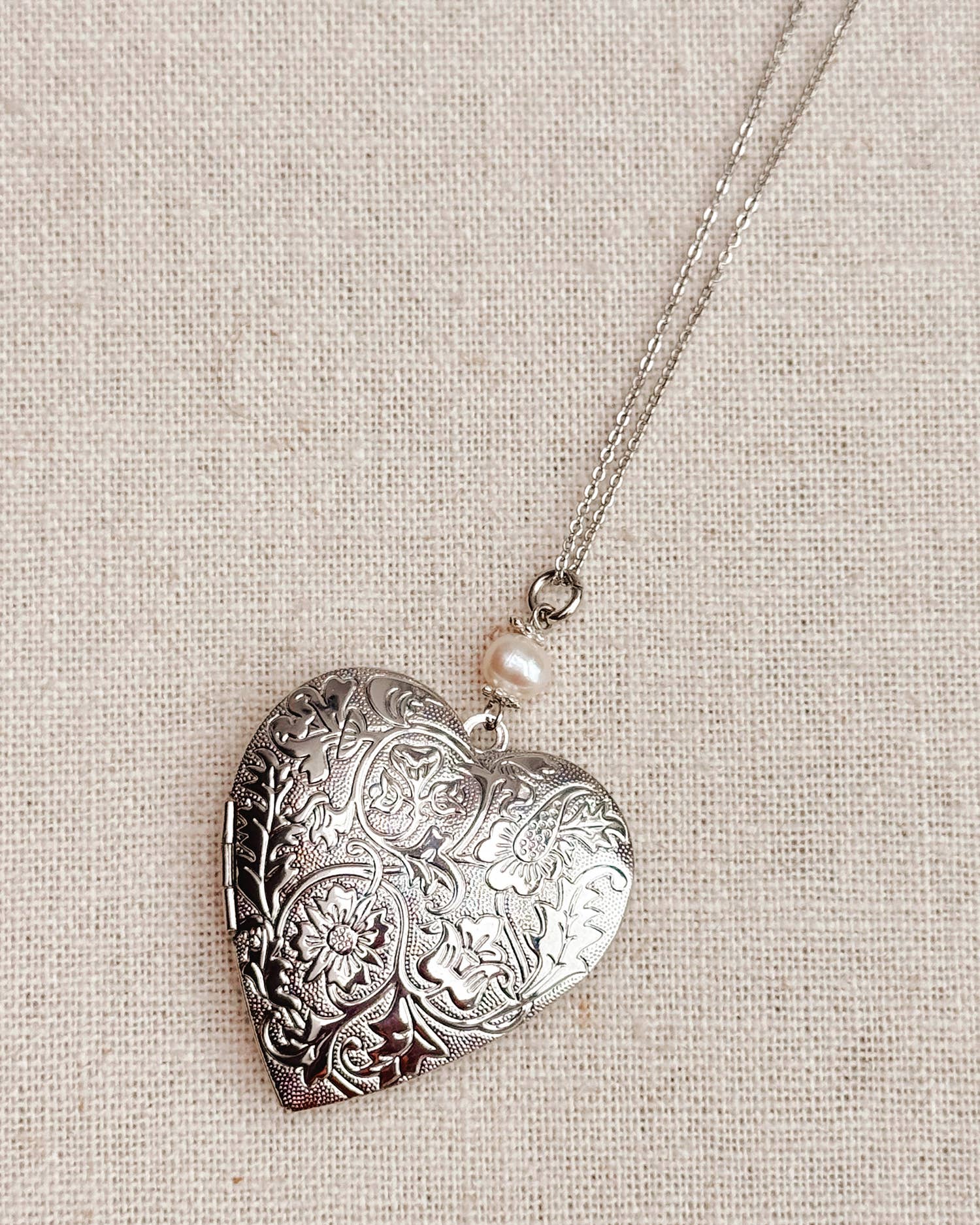 Gracie Rose Designs - Large Silver Heart Locket Freshwater Pearl Necklace