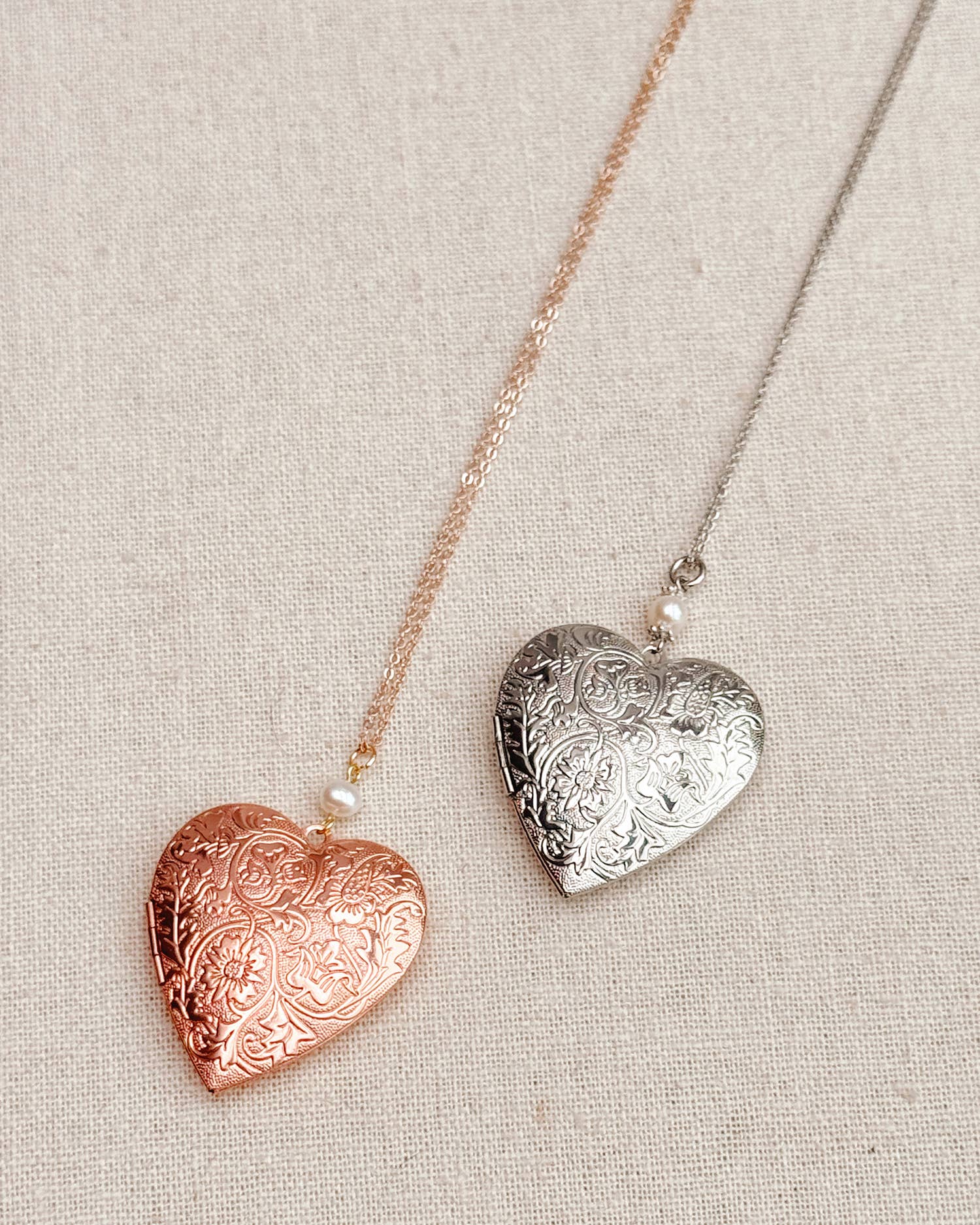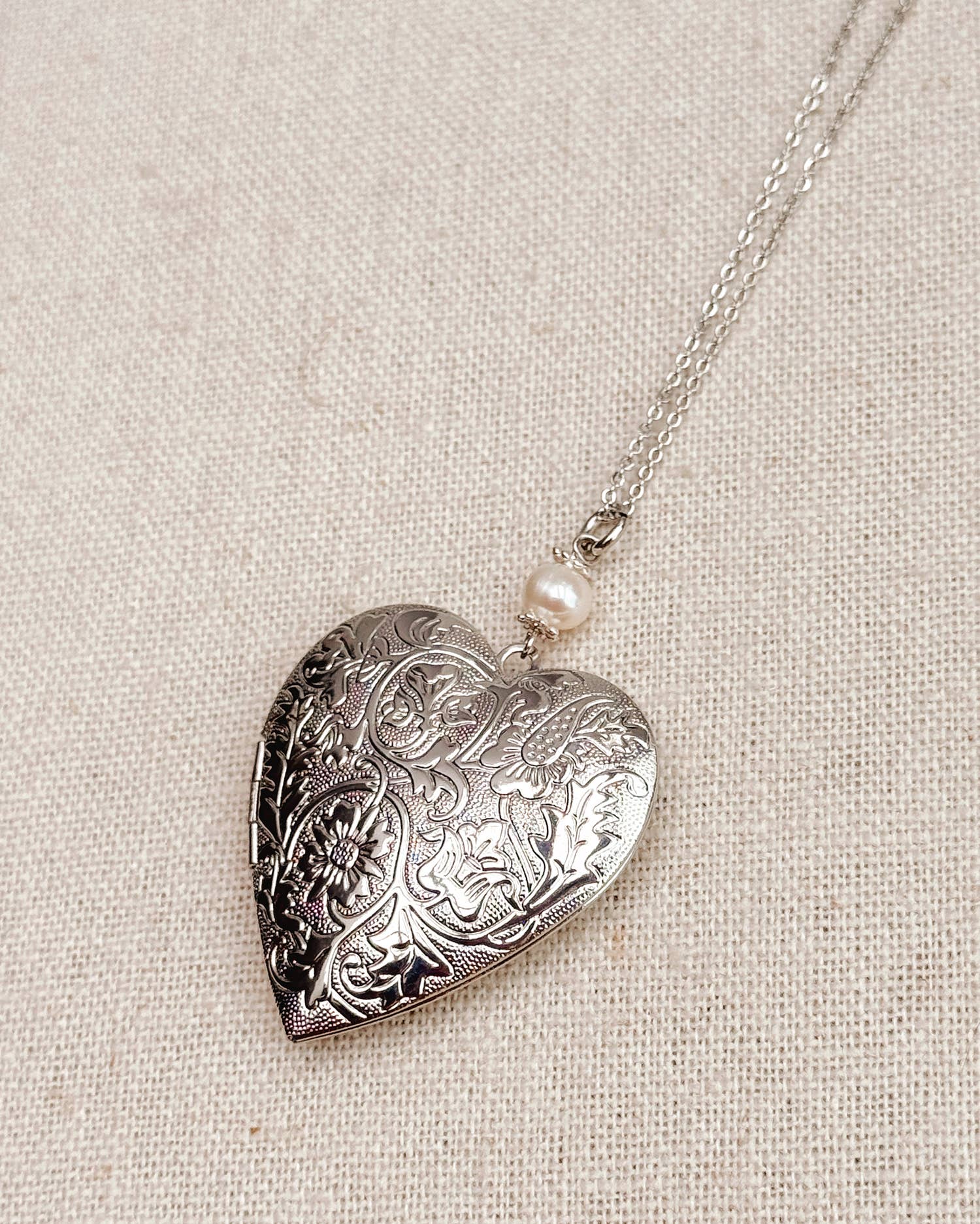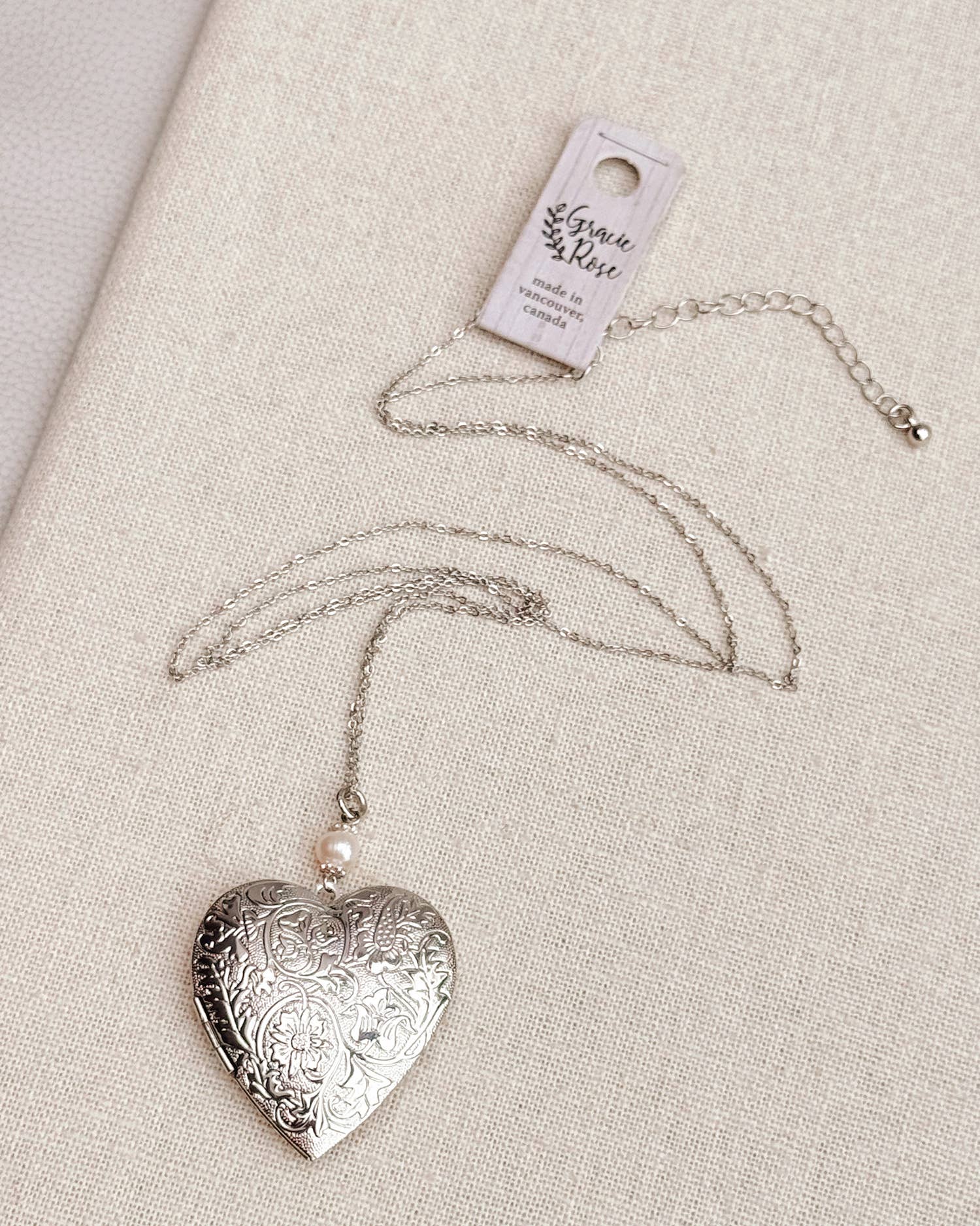 A beautifully embossed large heart locket in rhodium, accented with a freshwater pearl. This Gracie Rose design keeps sentiment close, blending vintage texture with timeless shine.