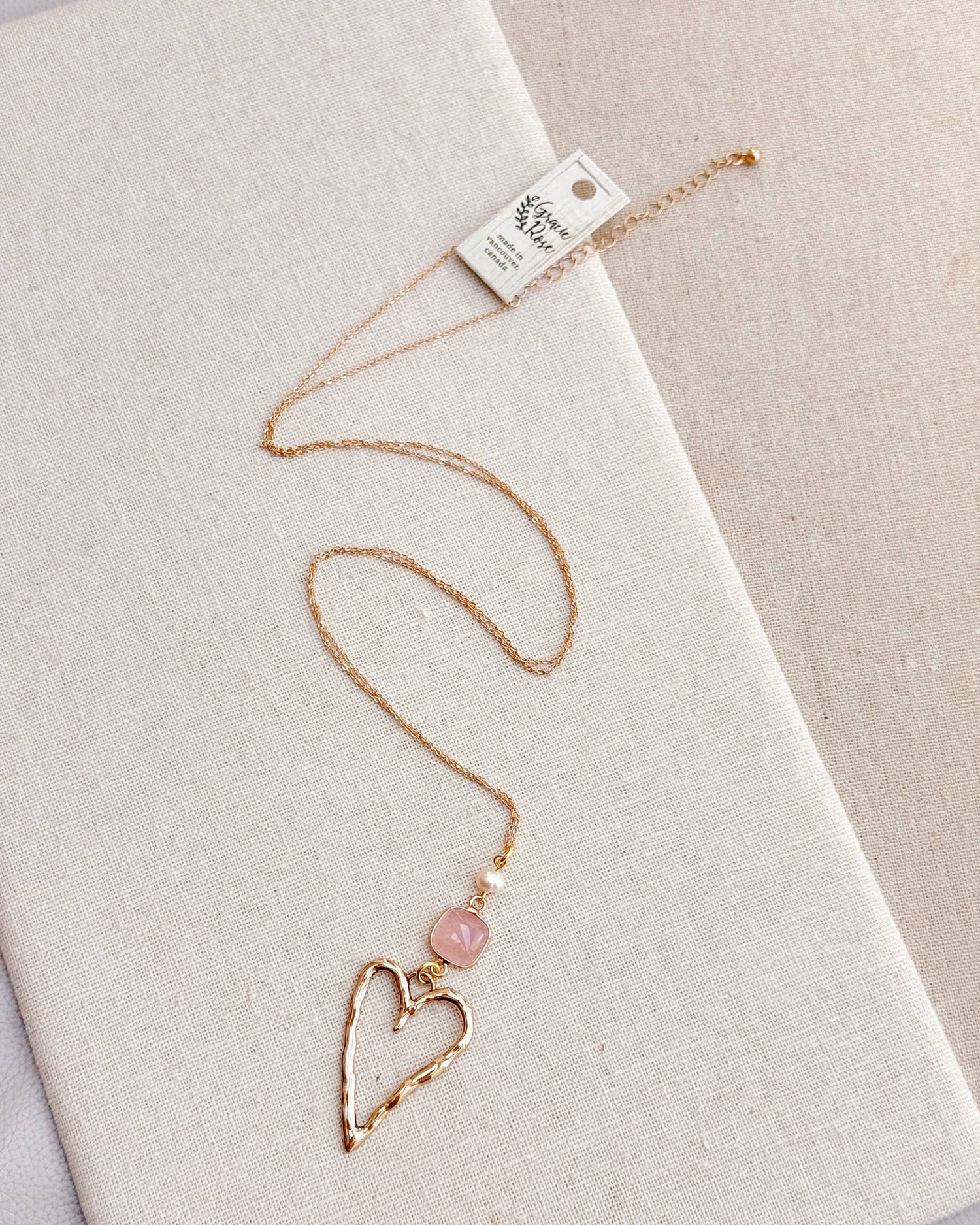 Gracie Rose Designs - Romantic Gold Rose Quartz Love Heart Pendant Long Necklace