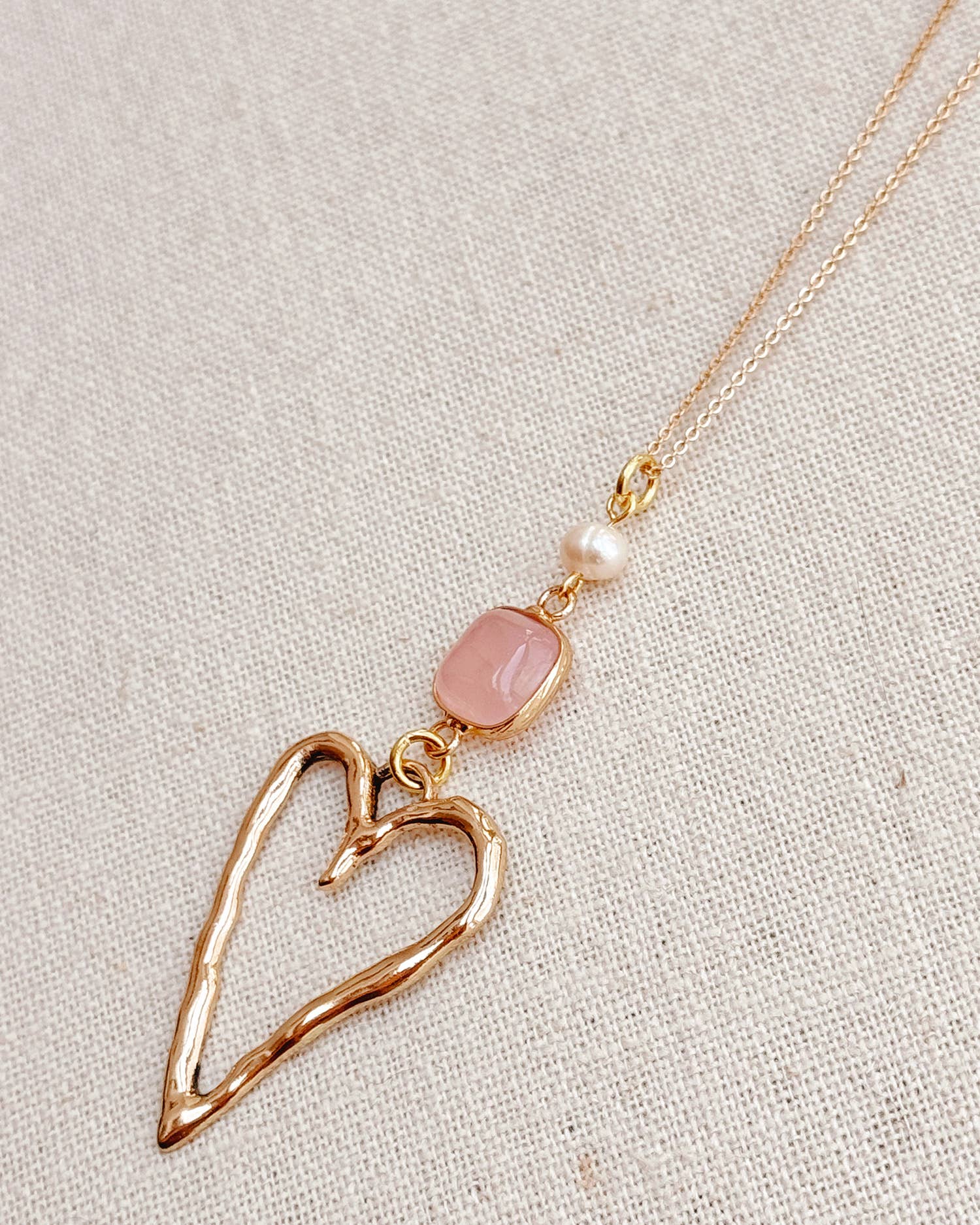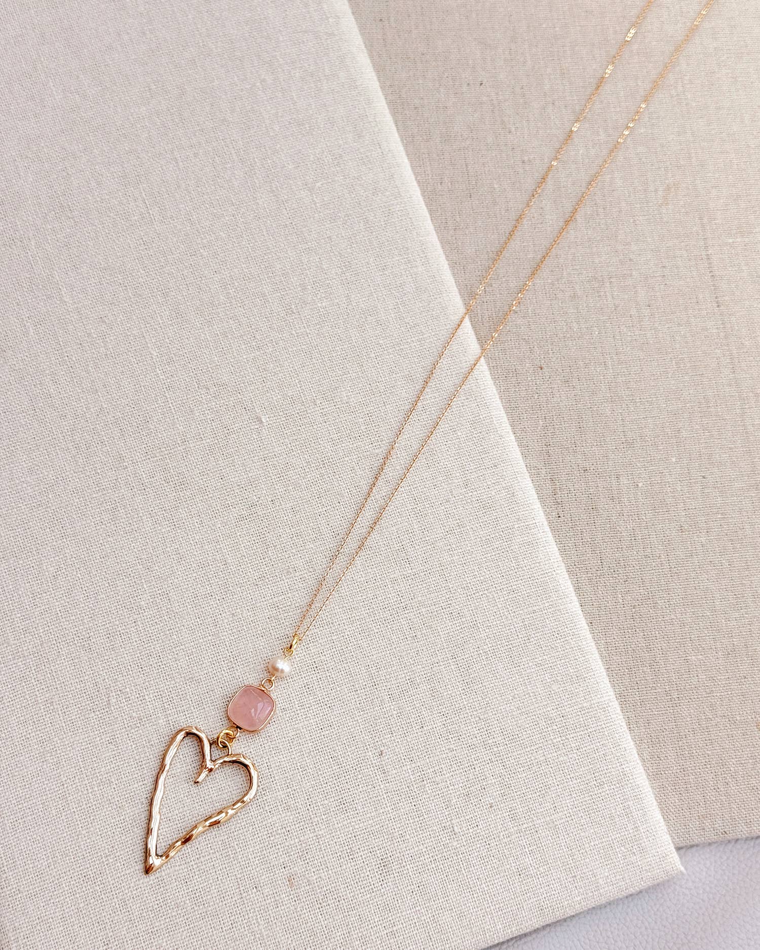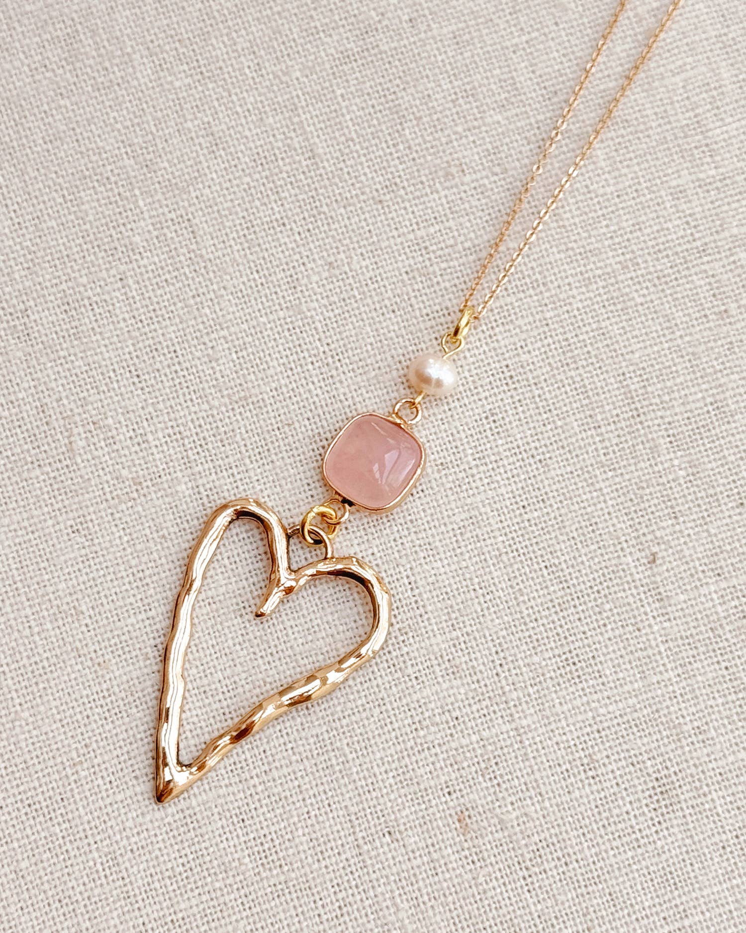 Experience timeless elegance with the Gracie Rose Gold Rose Quartz Love Heart Pendant Long Necklace. This long necklace features a stunning rose quartz pendant with freshwater pearl and a hammered heart that exudes a delicate yet luxurious vibe.