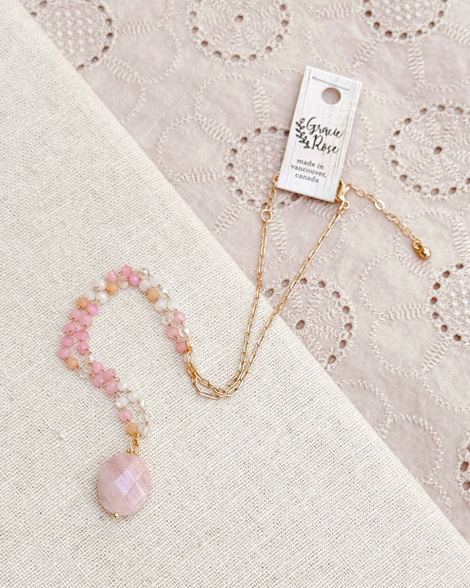 Gracie Rose Designs - Rose Quartz Pendant Necklace with Blush Beaded Chain