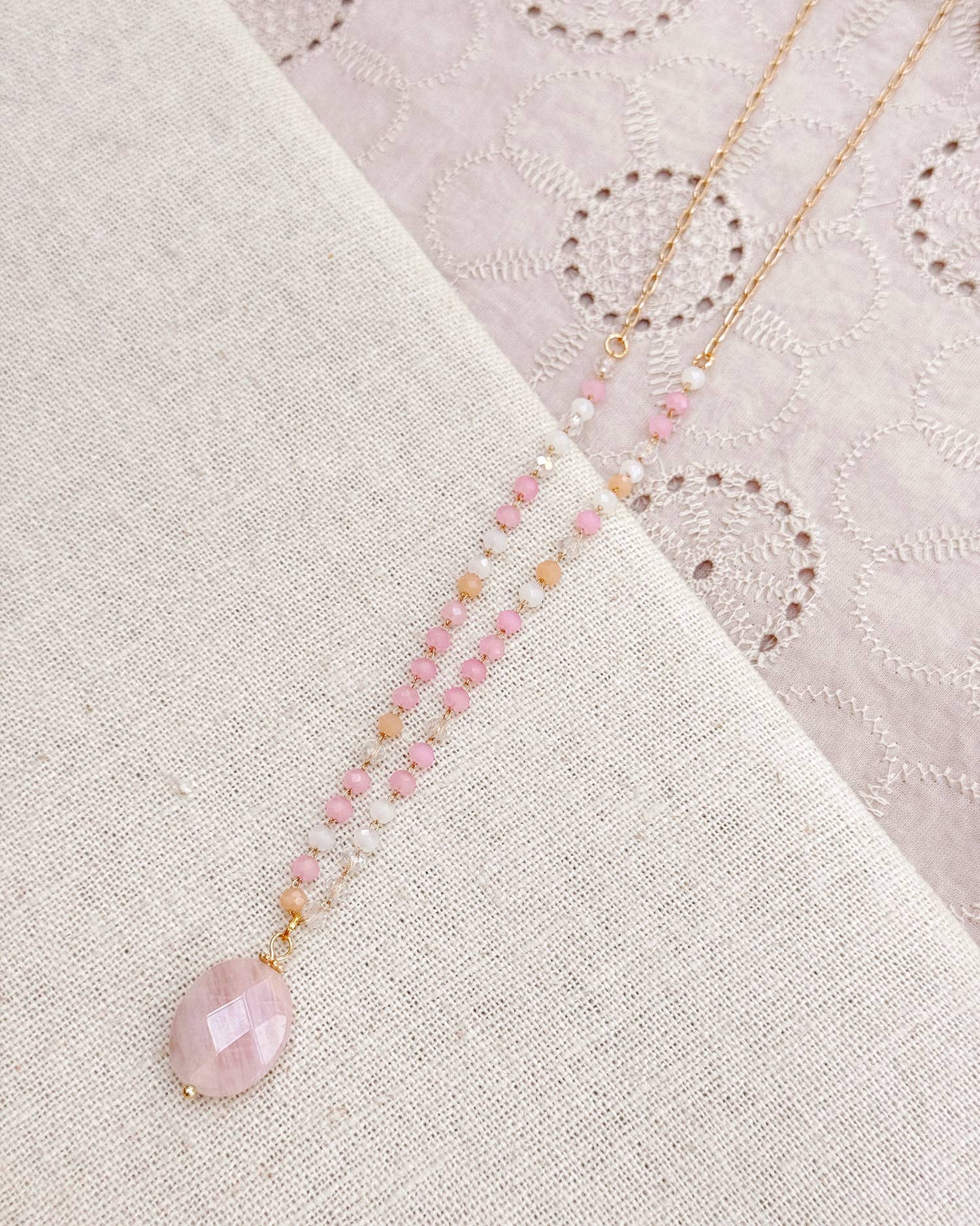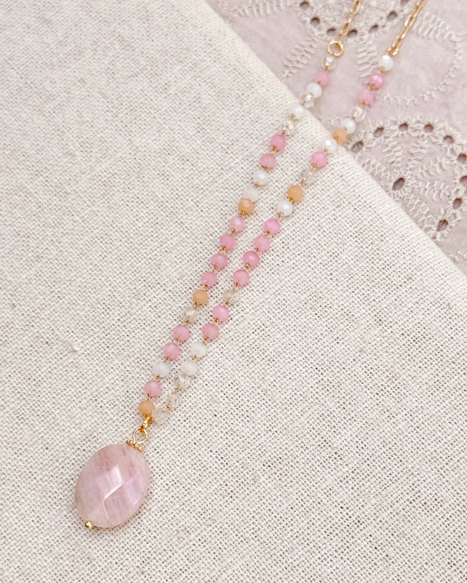 This soft pink necklace features an oval faceted rose quartz pendant suspended from a strand of blush-toned beaded chain. Feminine and calming, it layers beautifully with other neutrals or stands out on its own.