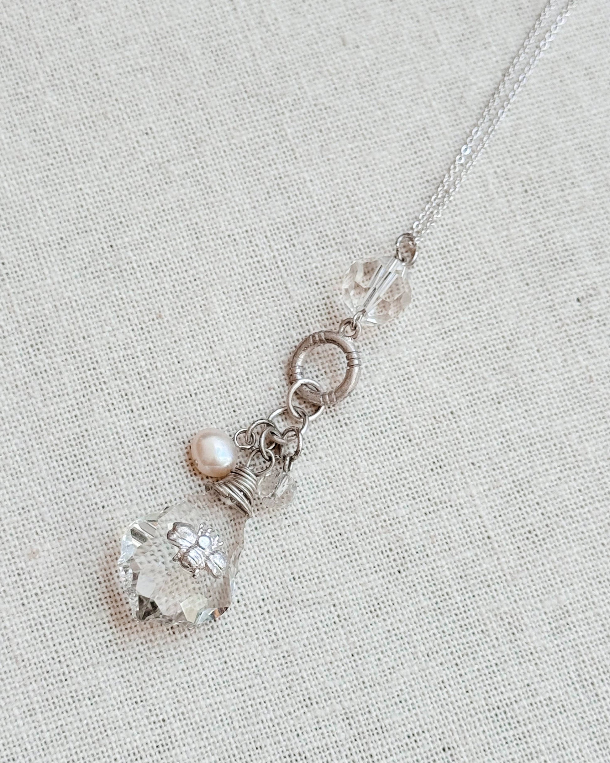 This elegant Gracie Rose necklace features a stunning matte silver bumble bee crystal pendant adorned with crystals and a lustrous freshwater pearl. With its timeless design and luxurious details, this necklace is the perfect statement piece for any occasion.