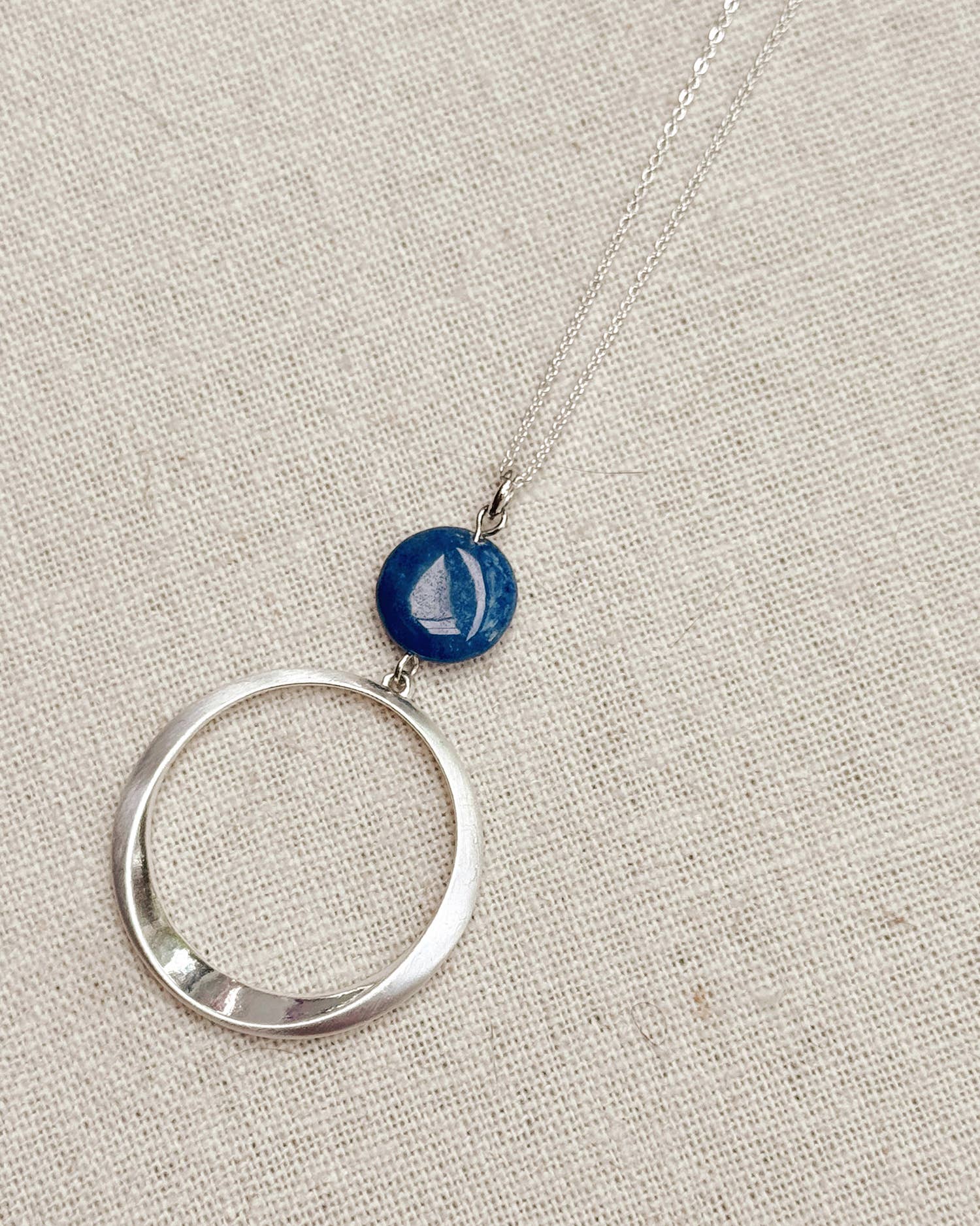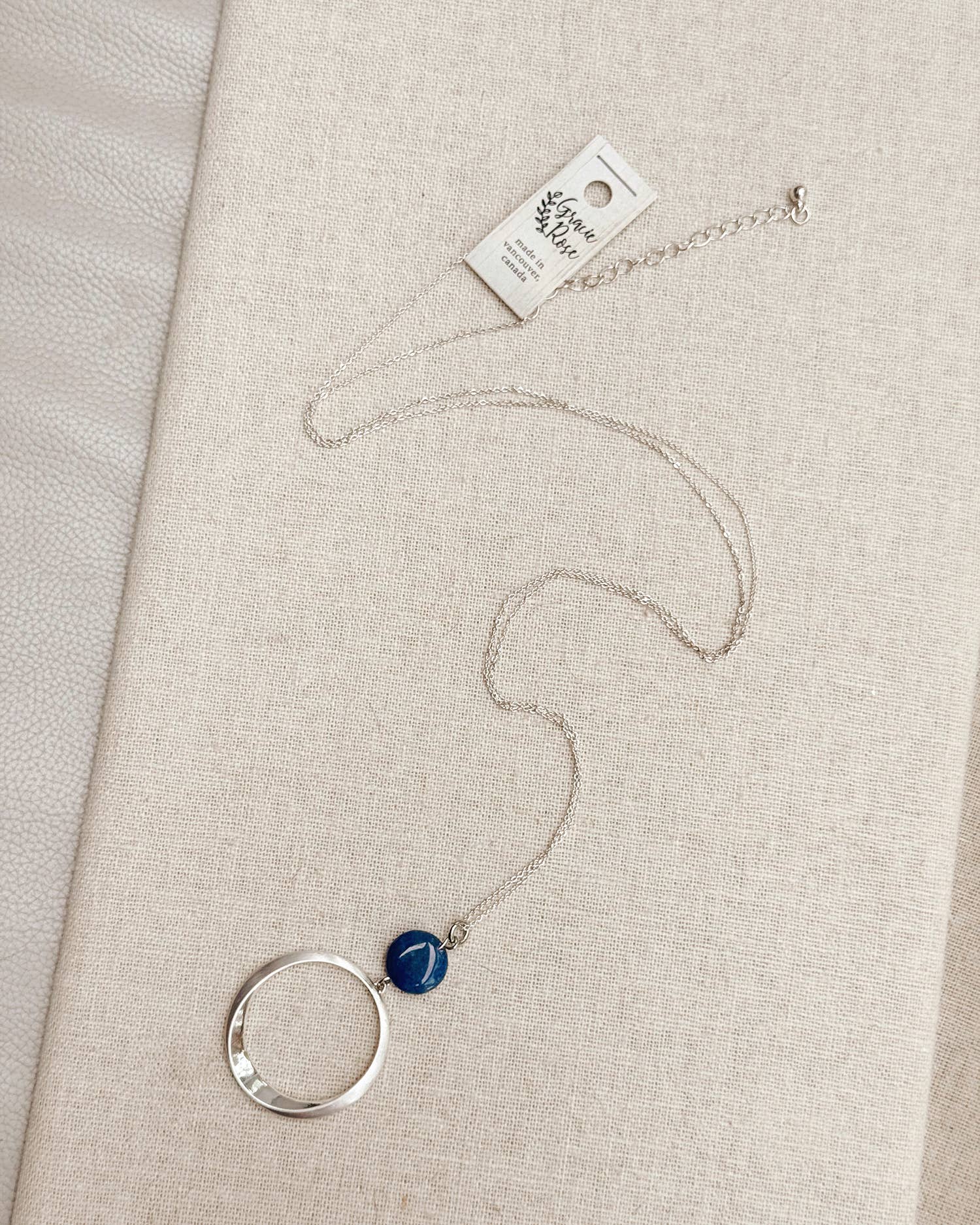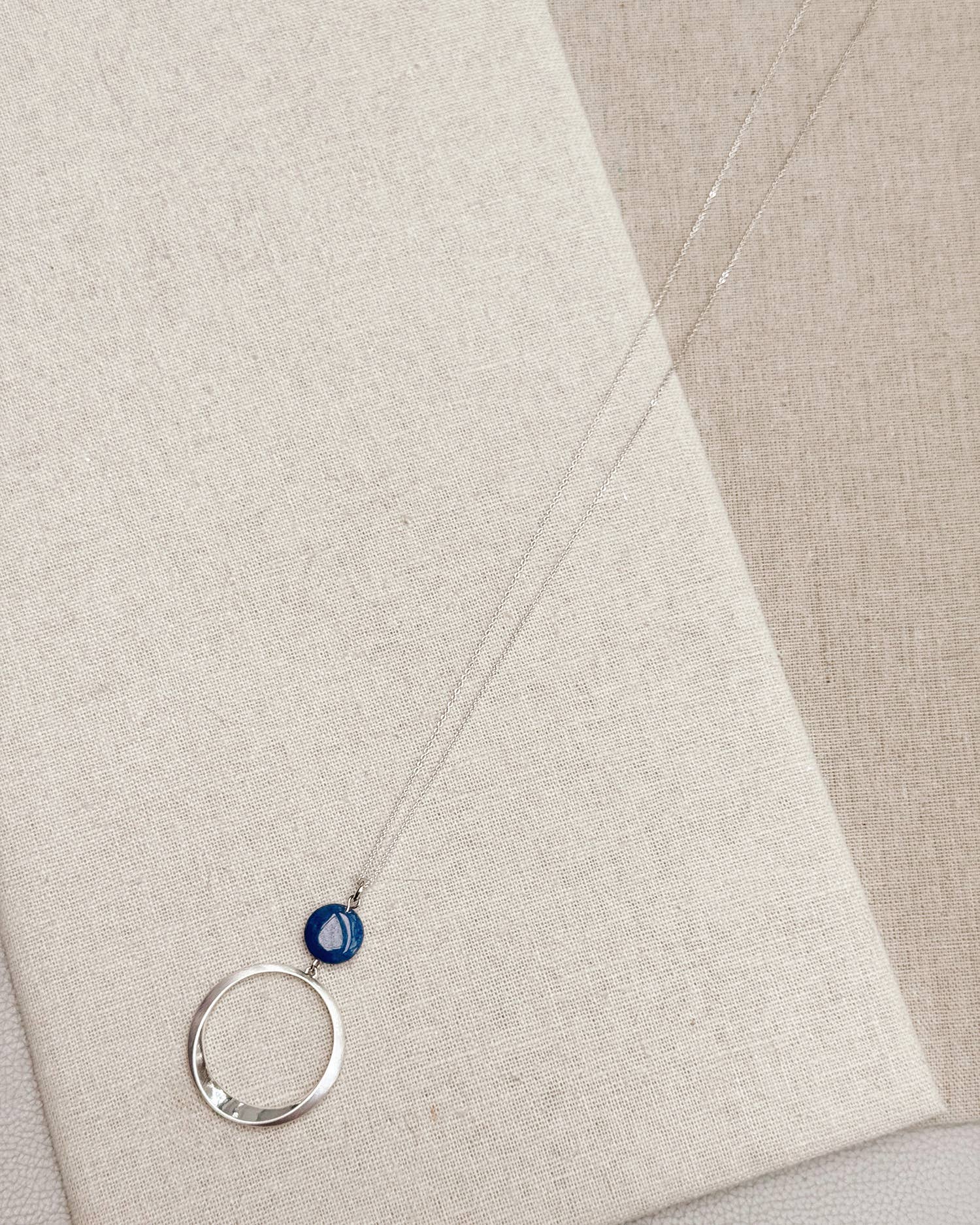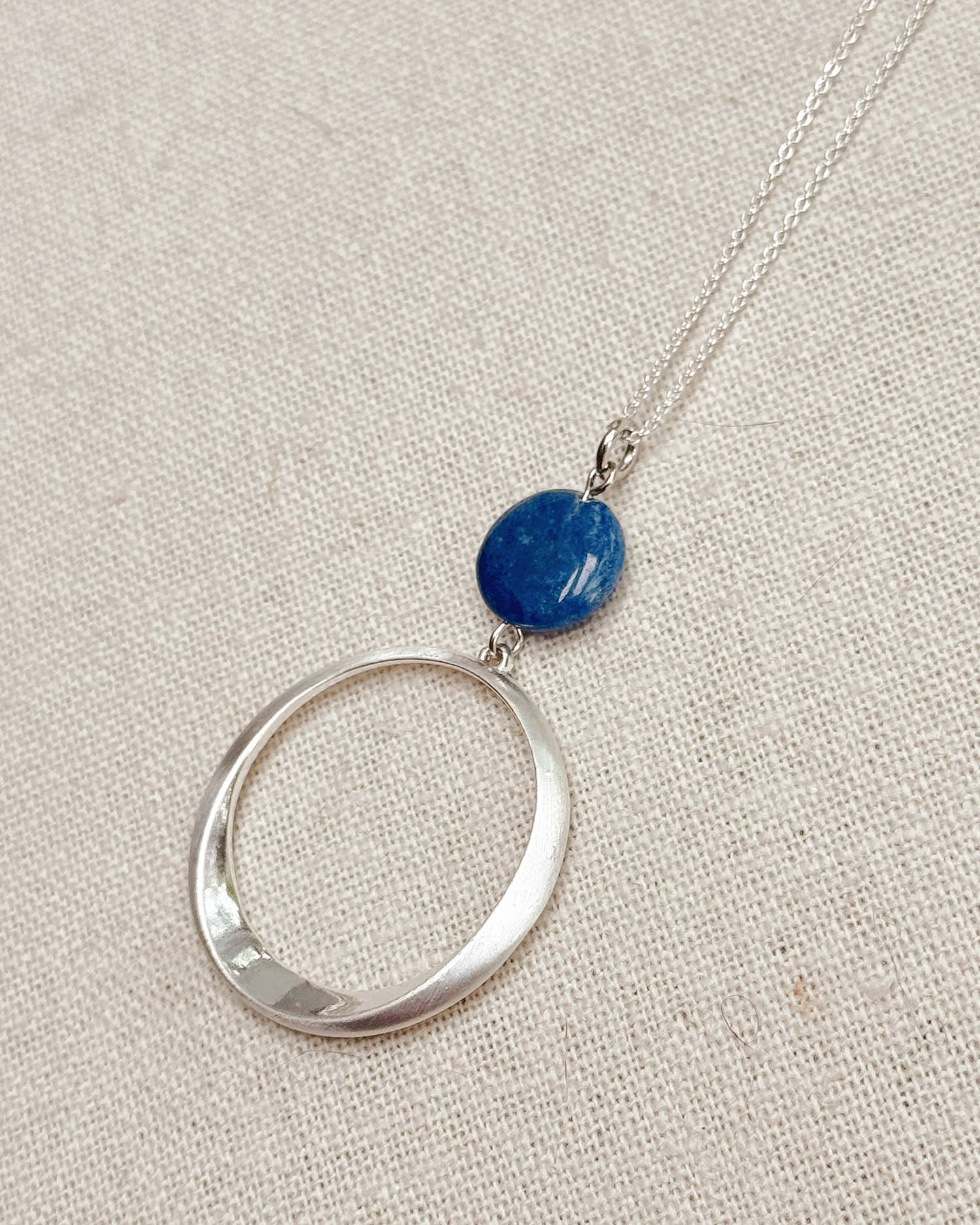 A polished silver ring pendant is paired with deep blue sodalite stone. Timeless and sculptural, it’s an everyday statement with quiet strength.