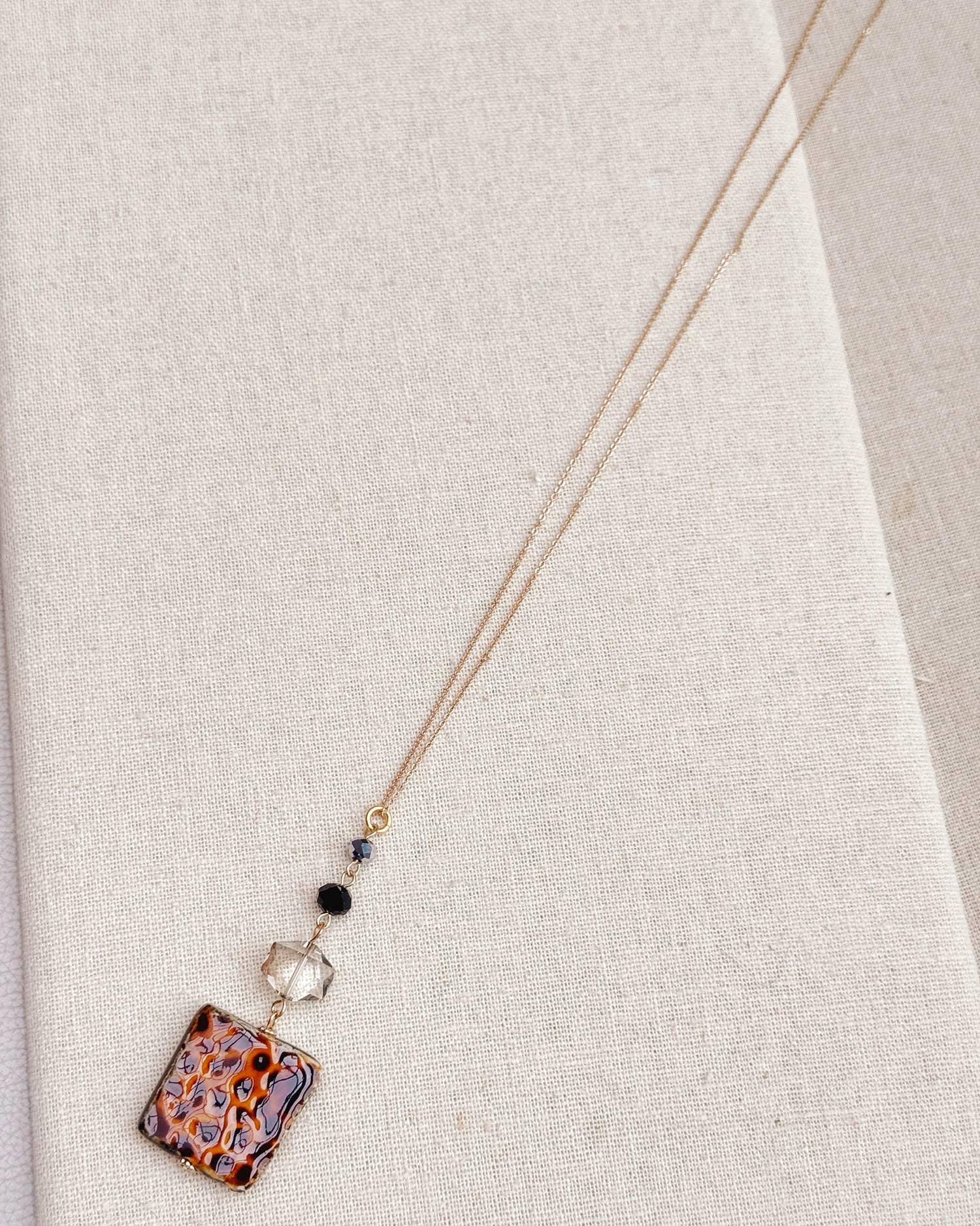 A blend of vintage charm and modern texture, this tortoiseshell-style ceramic pendant is paired with faceted crystal beads. A bold accent that feels artful yet versatile.