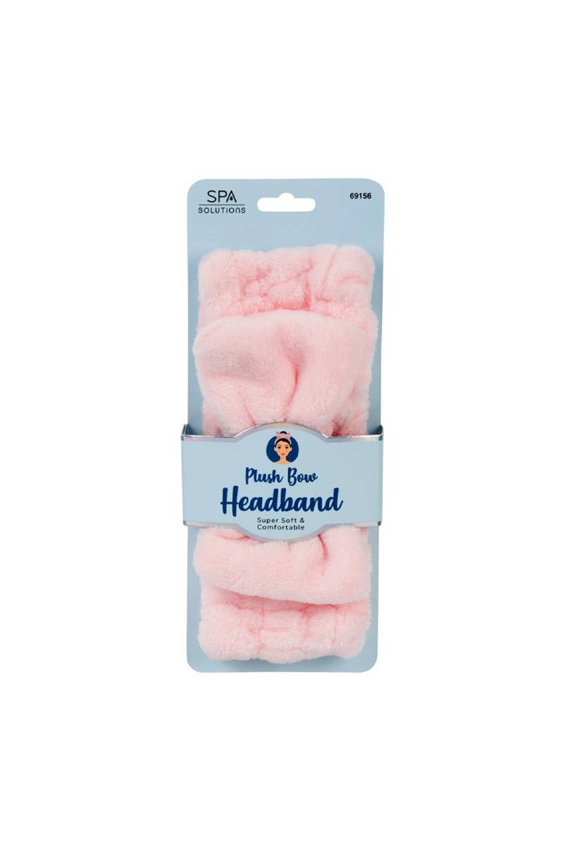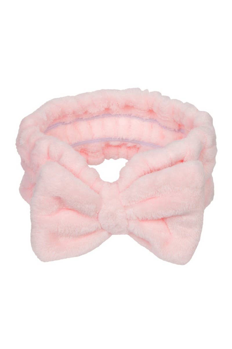 CALA Pink Plush Bow Headband. Super soft, plush headband keeps and holds hair in place. Features elastic stretchy band and plush texture that provides maximum comfort. Use while washing face, during skincare regimen, masking, and applying makeup.