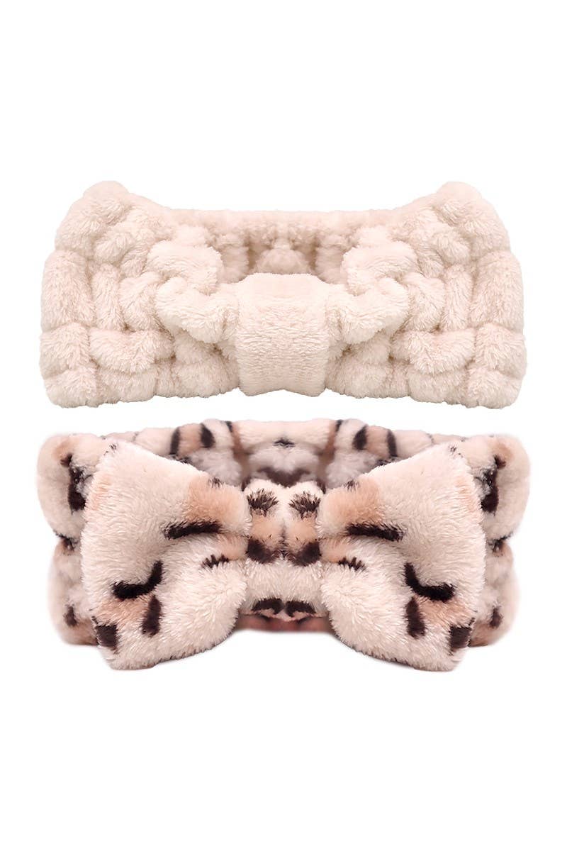 Leopard and Beige Plush Headband Duo. Super soft and comfortable 2 piece set. Ultimate accessory when pampering, cleansing, masking, or simply applying make-up.