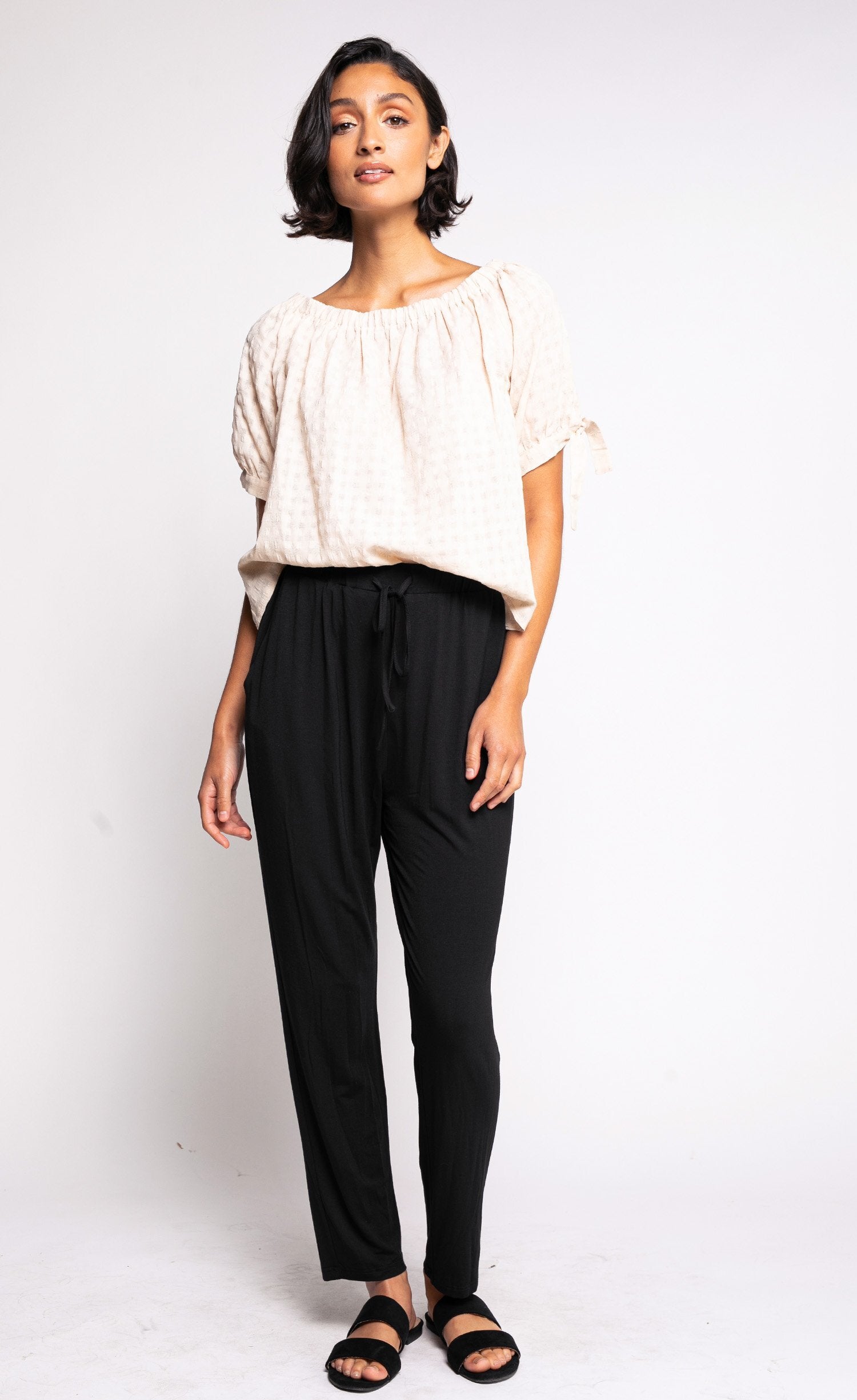 Relaxed fit. Model in black is 5'8 and wears XS. Waist has elastic band, fabric stretches.