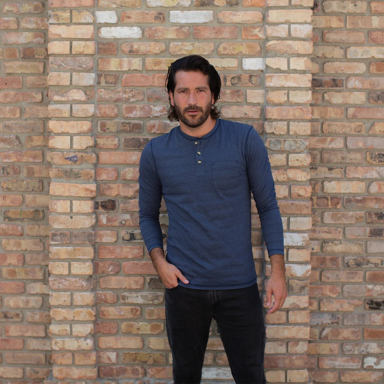 - Long sleeve novelty striped henley tee with a patch pocket.