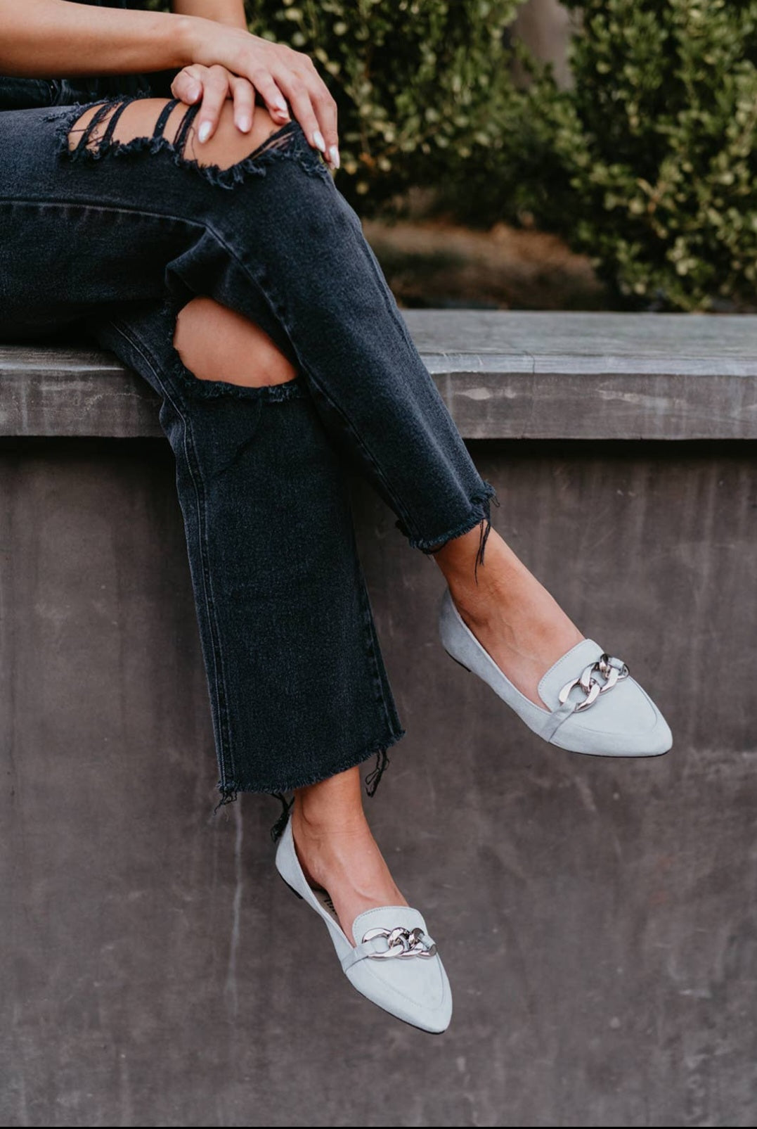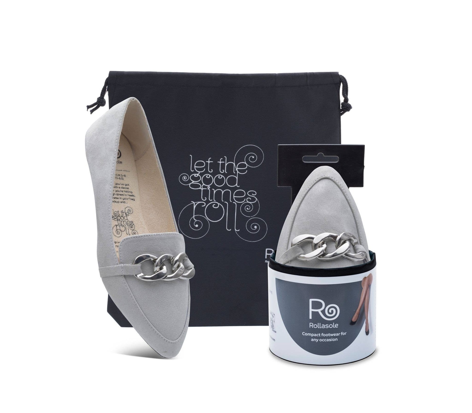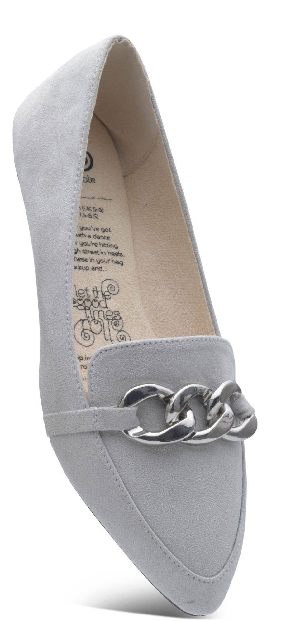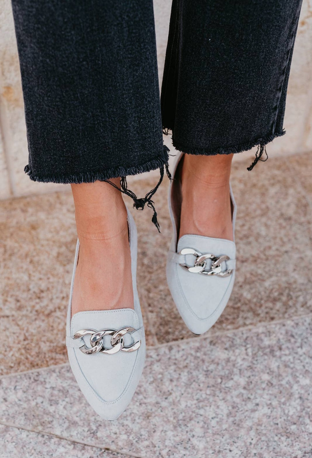 Combining enduring style with lasting comfort. These perfect pastel Rollasole loafers are perfect addition to your autumn wardrobe. A silver effect chain runs across the width of the shoe, adding an element of opulence to this classic design. This shoe is a mix between light gray and light blue!