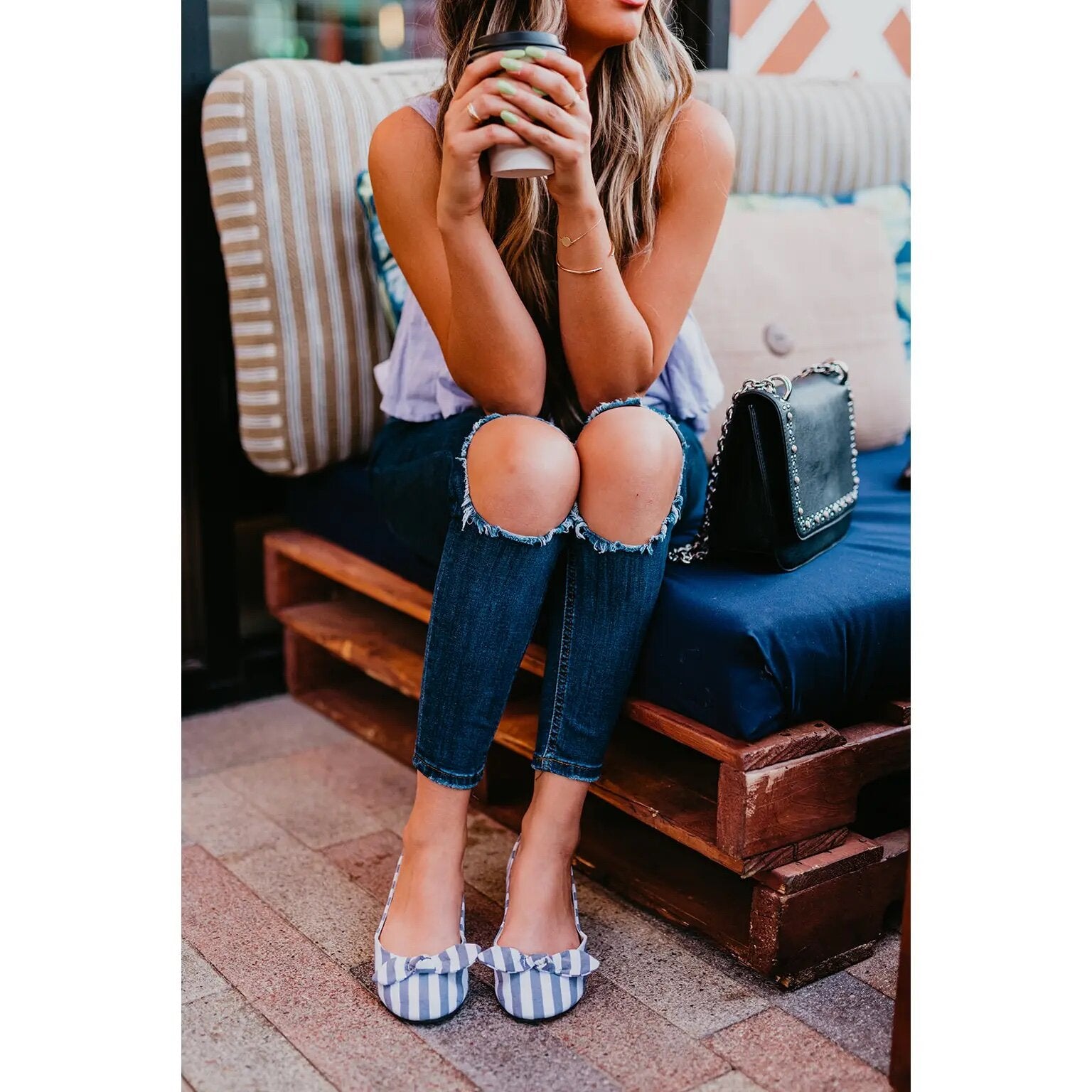 Our first Nautical design! These super cute ballerina flats perfectly toe the line between smart and casual style. With classic white and sea blue stripes and matching bow, make waves wherever you go as these fun flats will match almost any outfit.