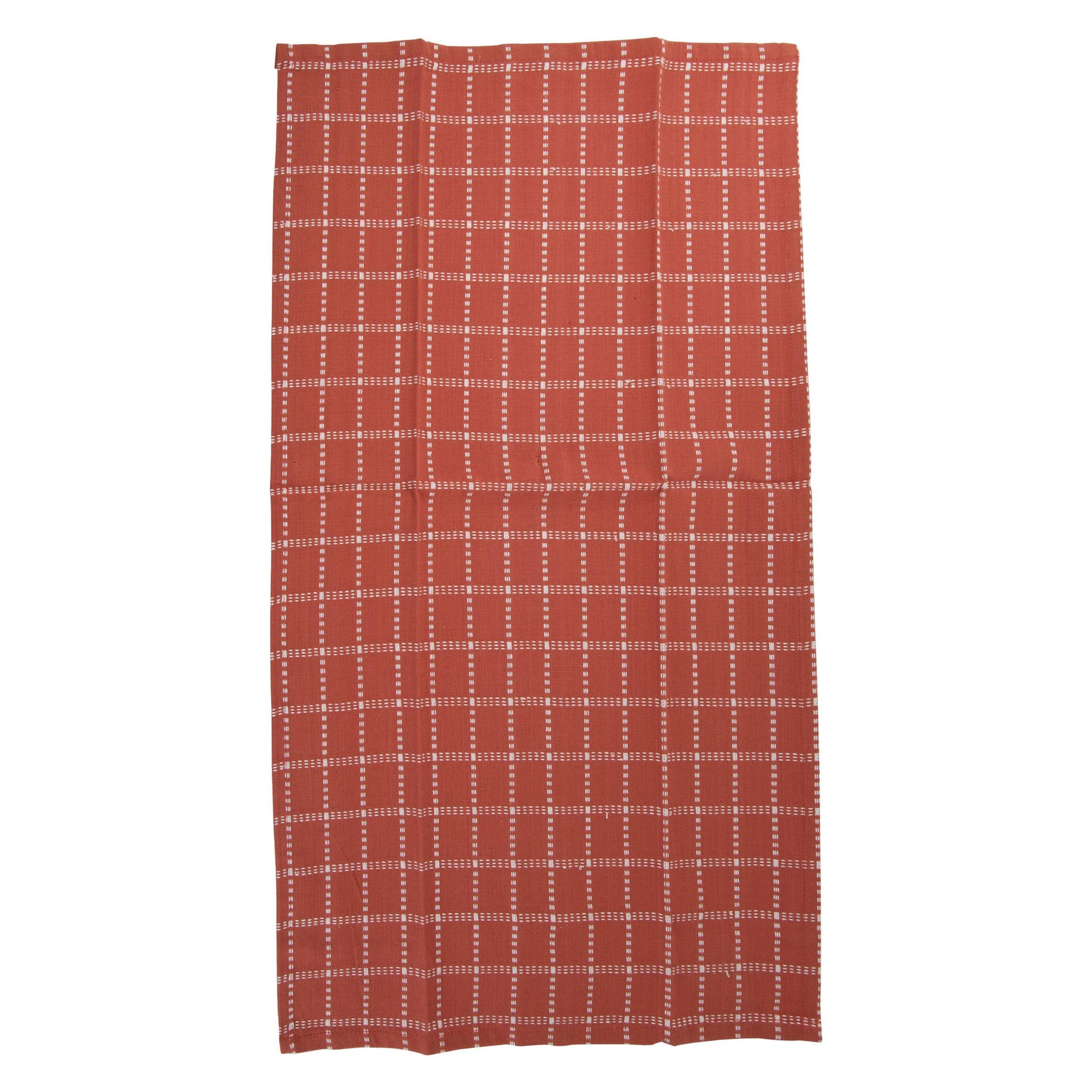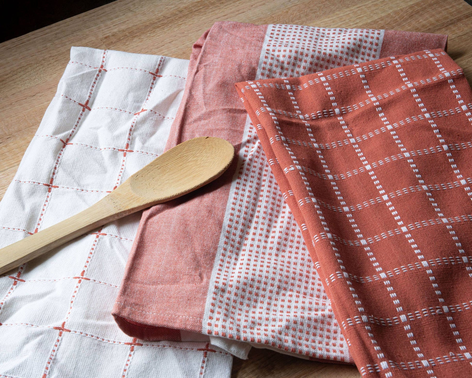 These kitchen basics are anything but boring with all the woven details! Three woven towels in a warm, earthy red color palette. Each towel has its own set of details, running stiches, matty woven check patterns or thick accent yarns. Each includes a fabric loop sewn in for hanging.