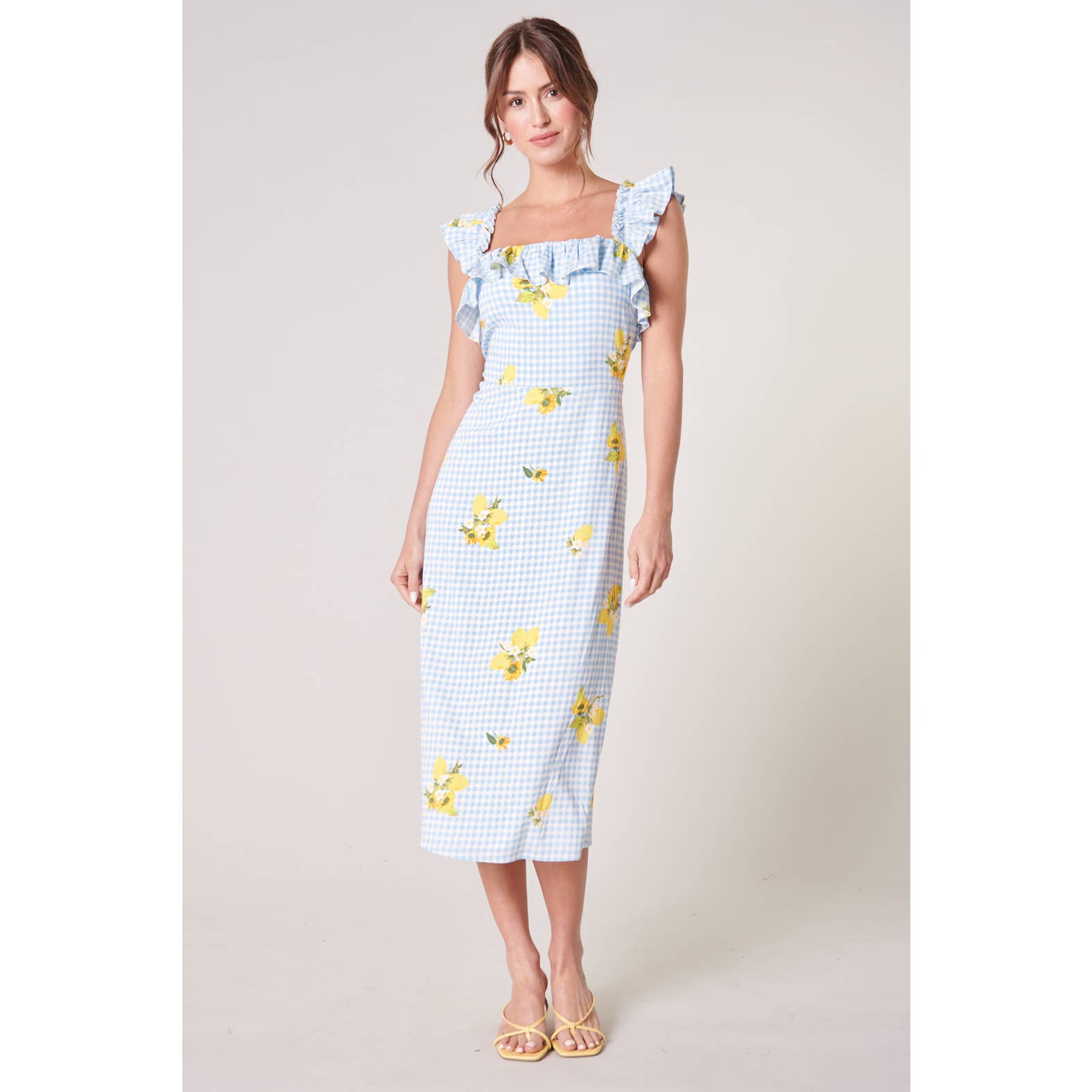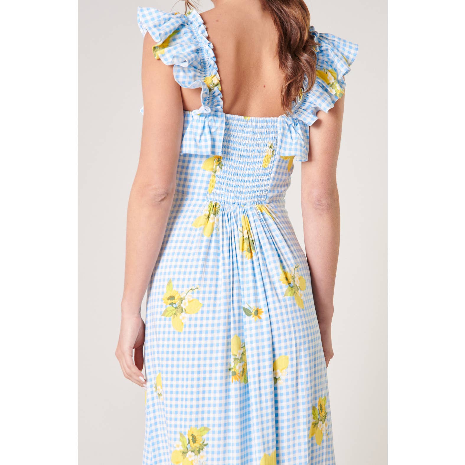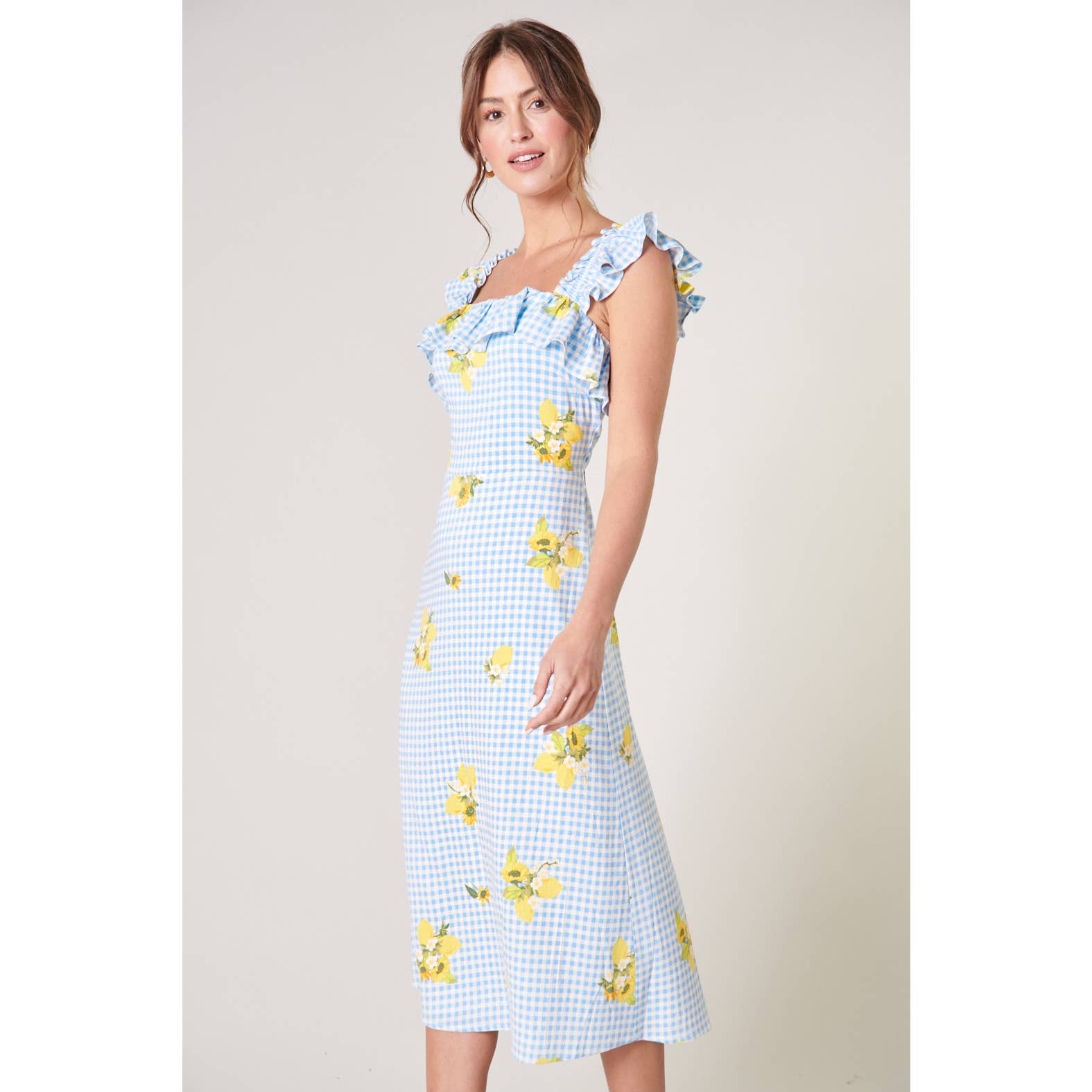 Perfect picnic attire. Yellow floral clusters against a blue picnic gingham shape the classic Milo Dress.